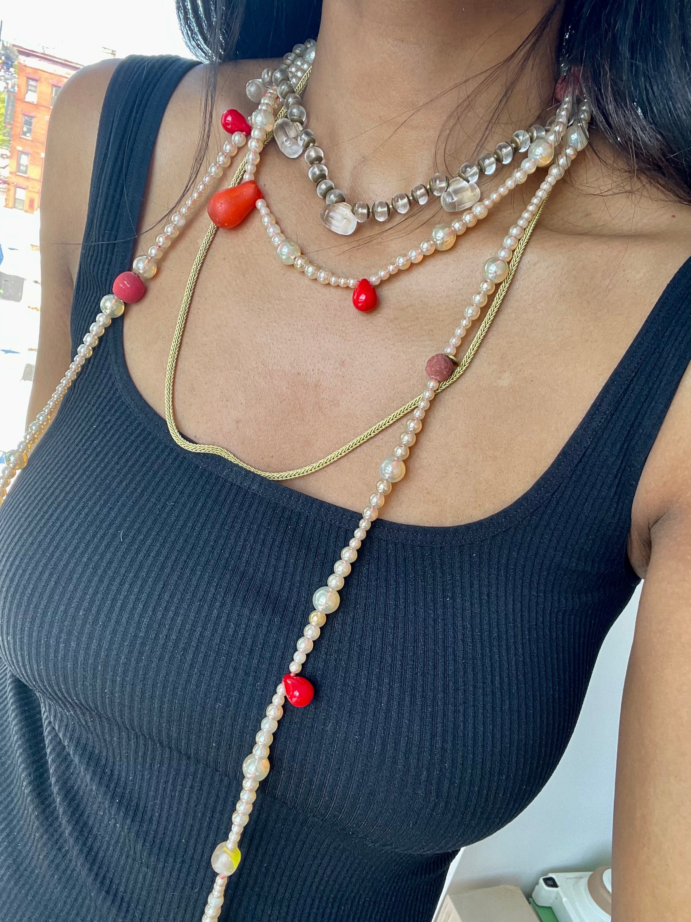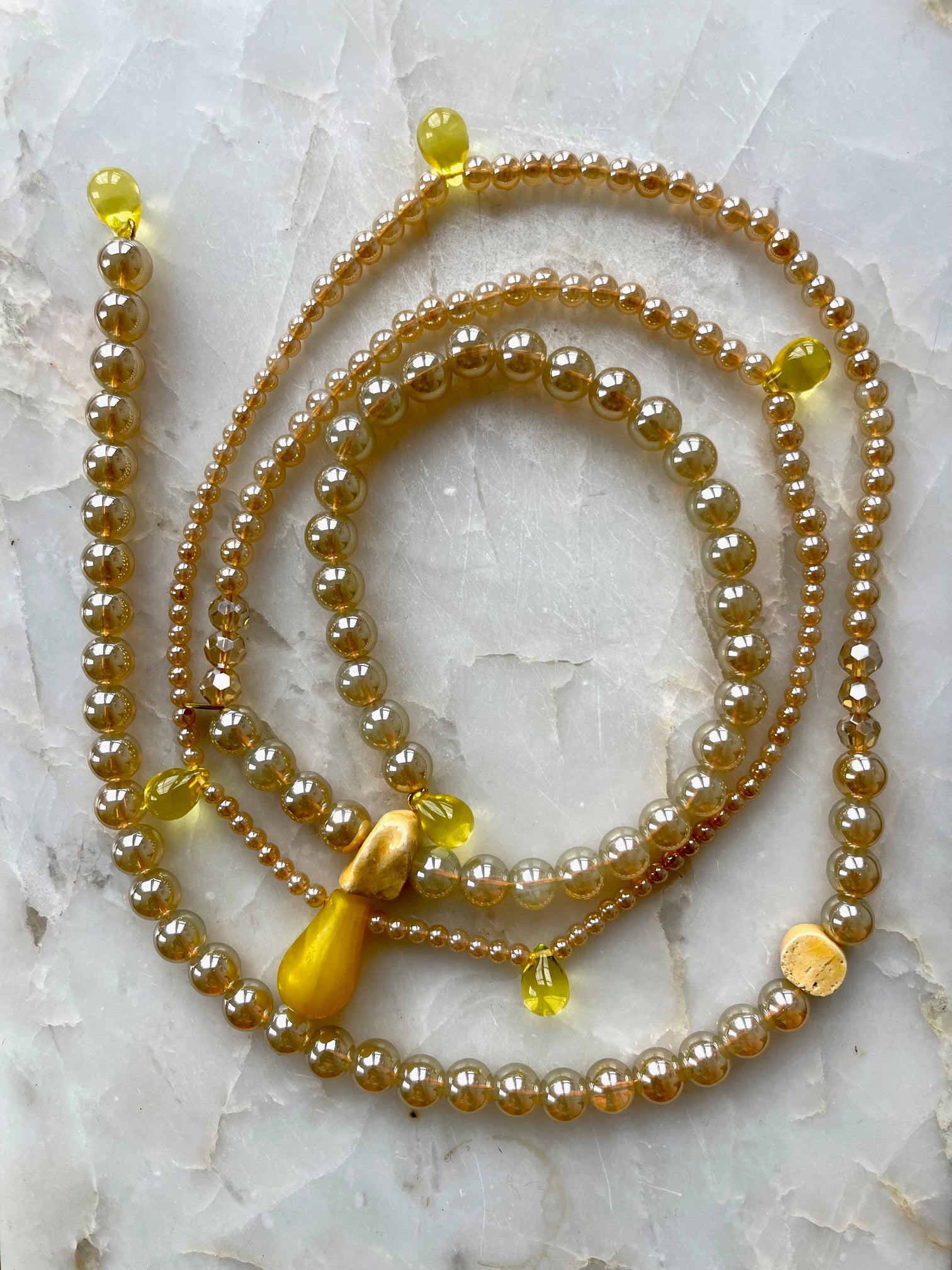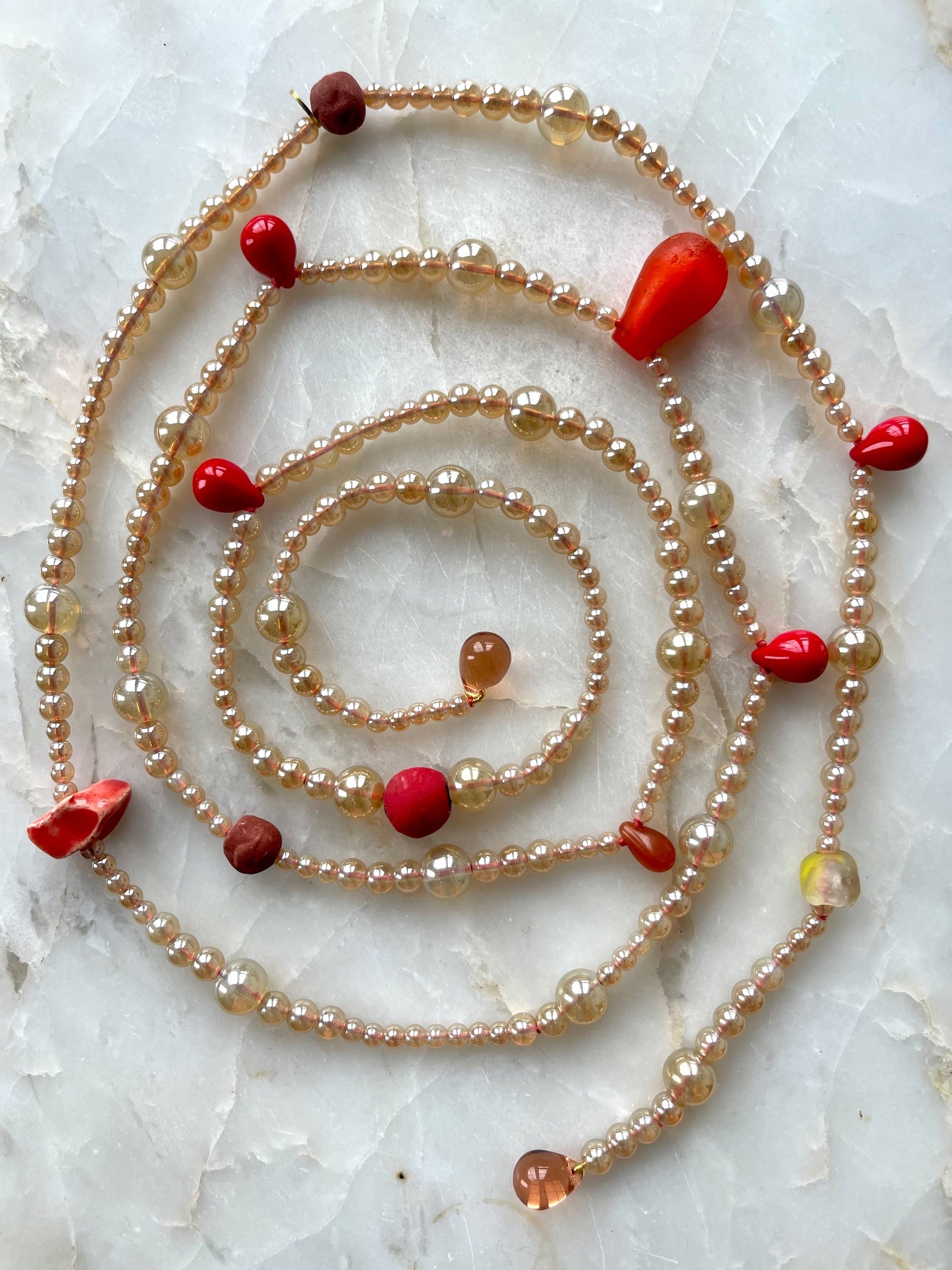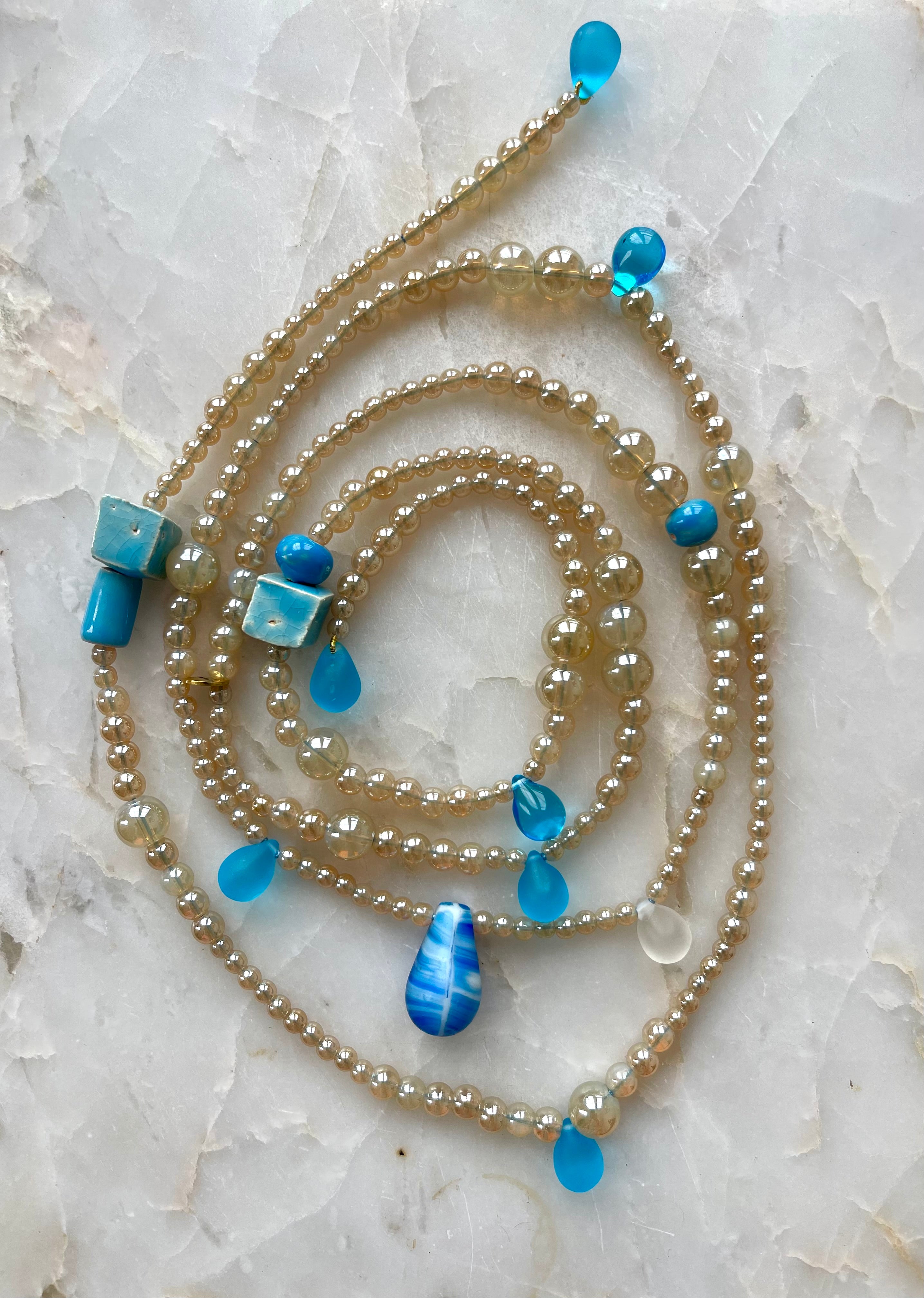 Each necklace measures 50-ish inches and is composed of glass rounds interspersed with handcrafted ceramic and African pressed glass beads, all brought together on silk thread.