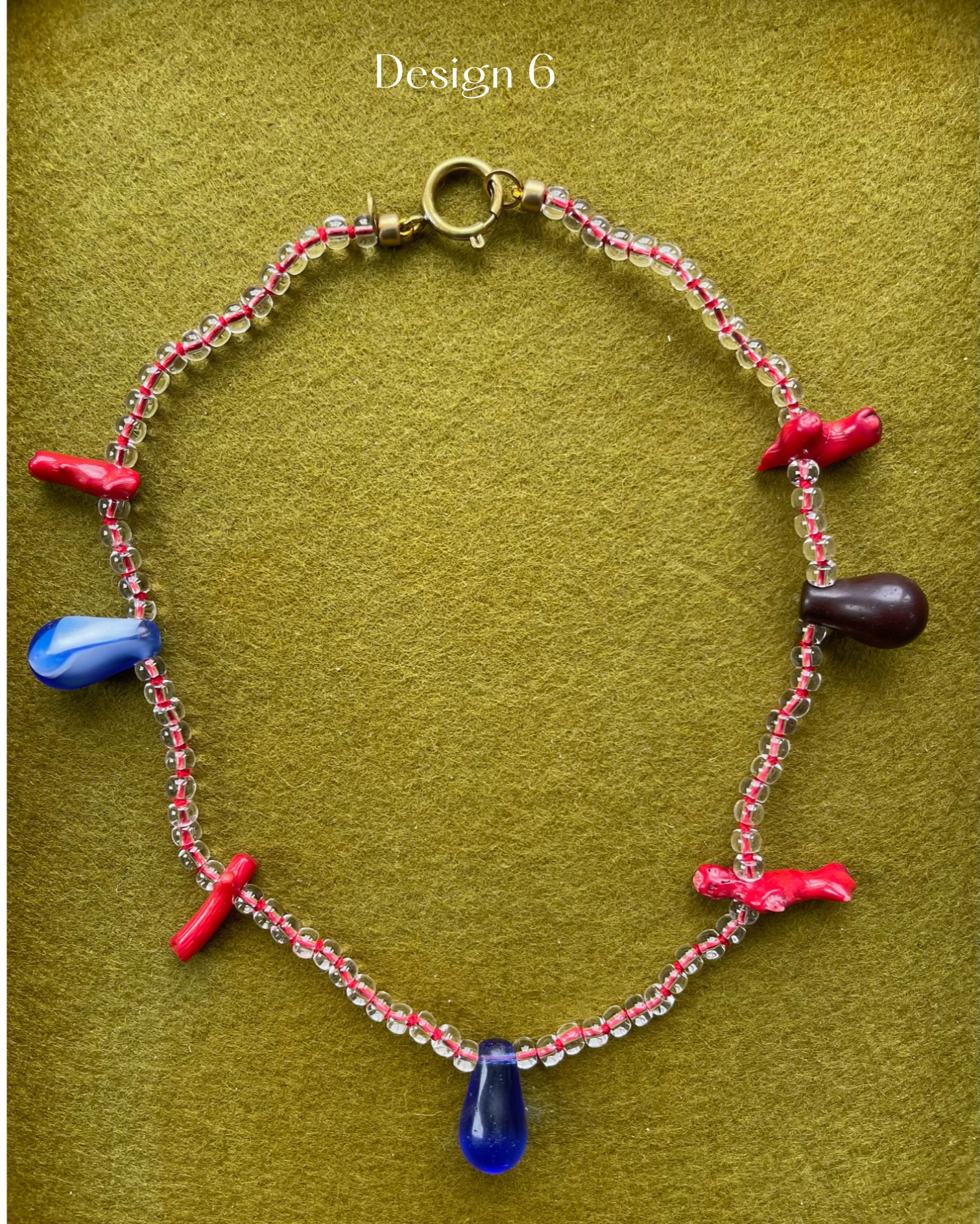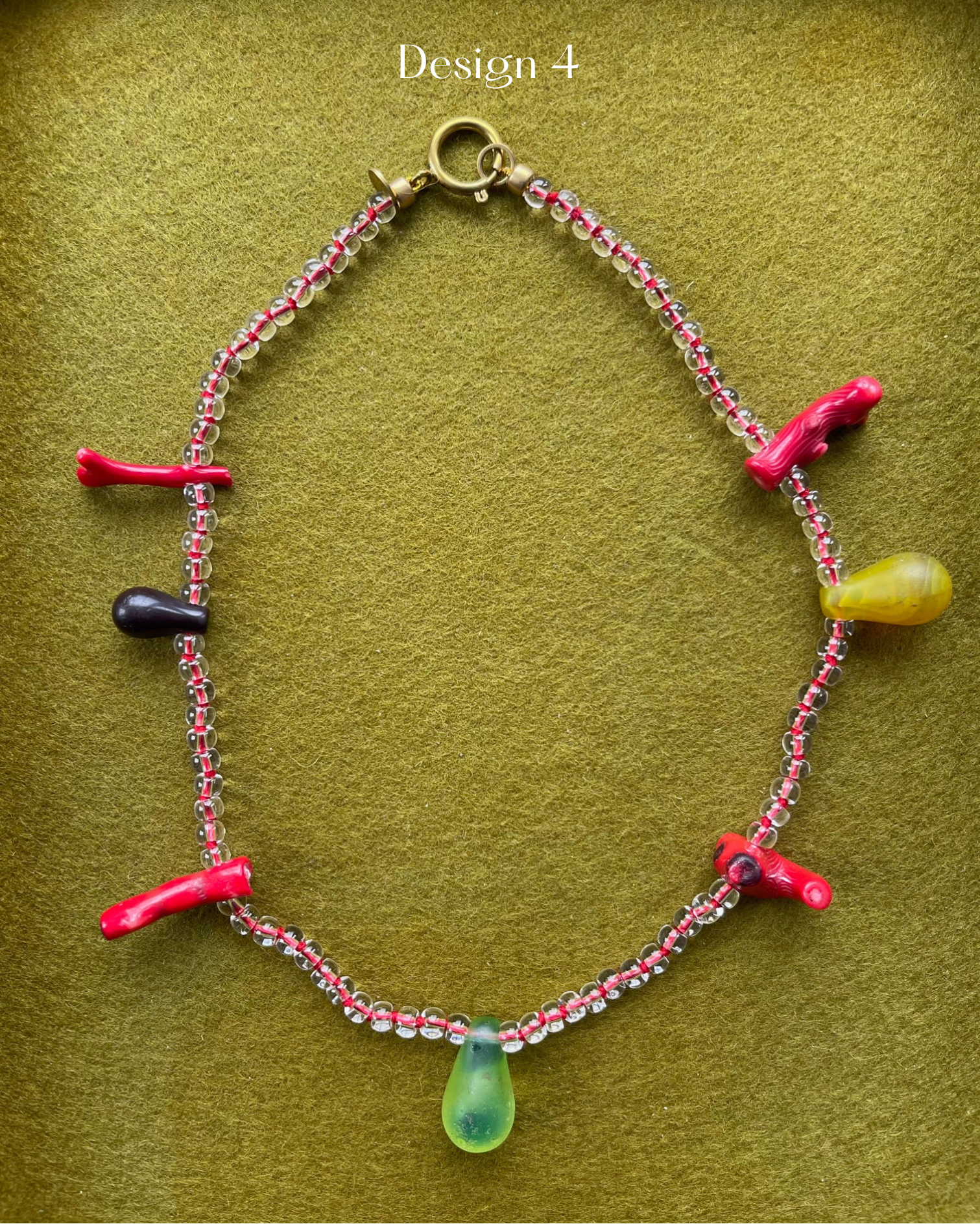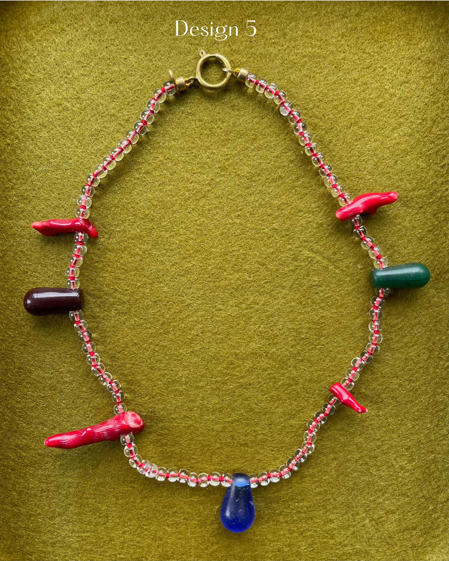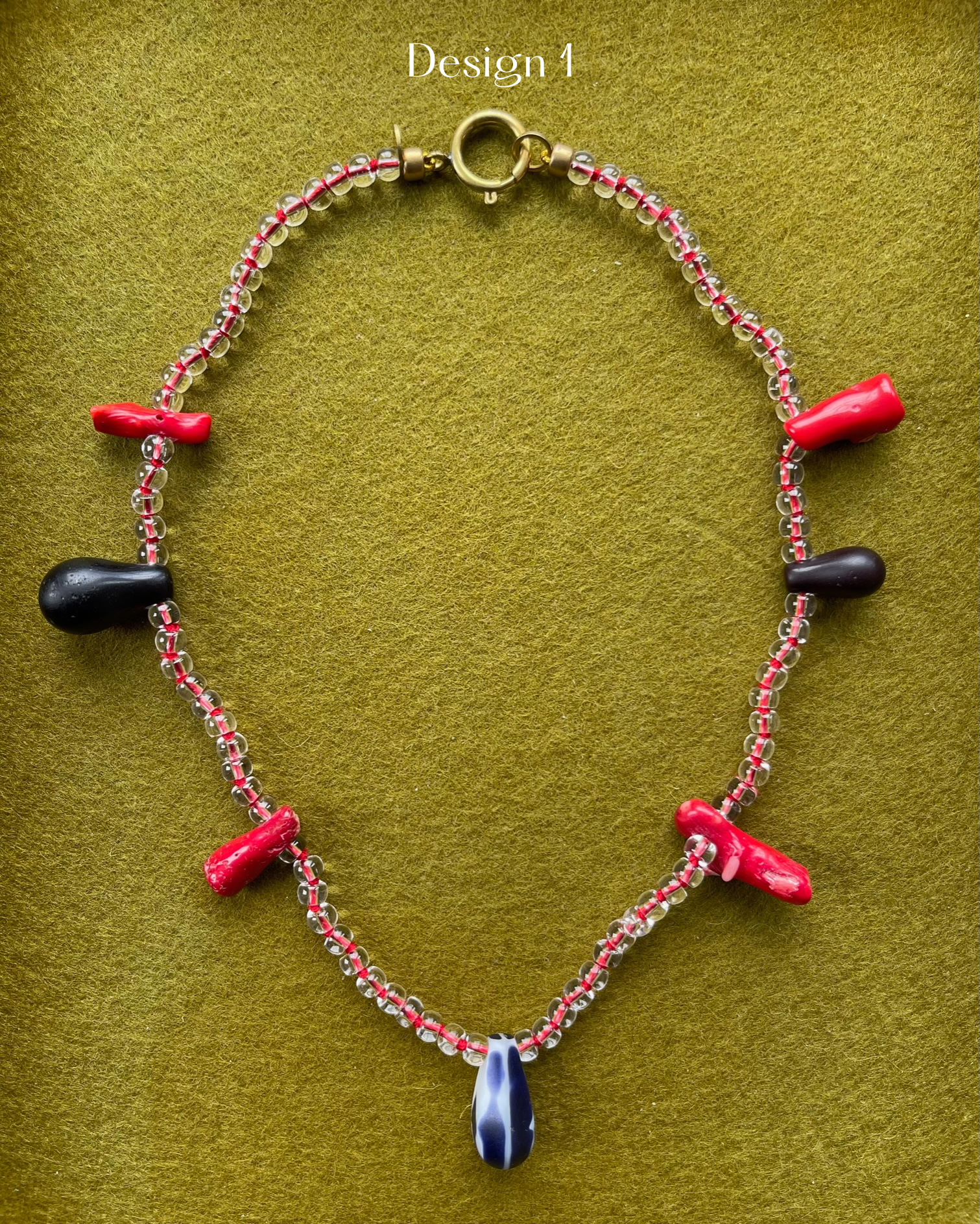 Each necklace measures approximately 20" and is composed of fully charged rock crystal, red coral and Mali Wedding beads - all brought together on knotted silk.