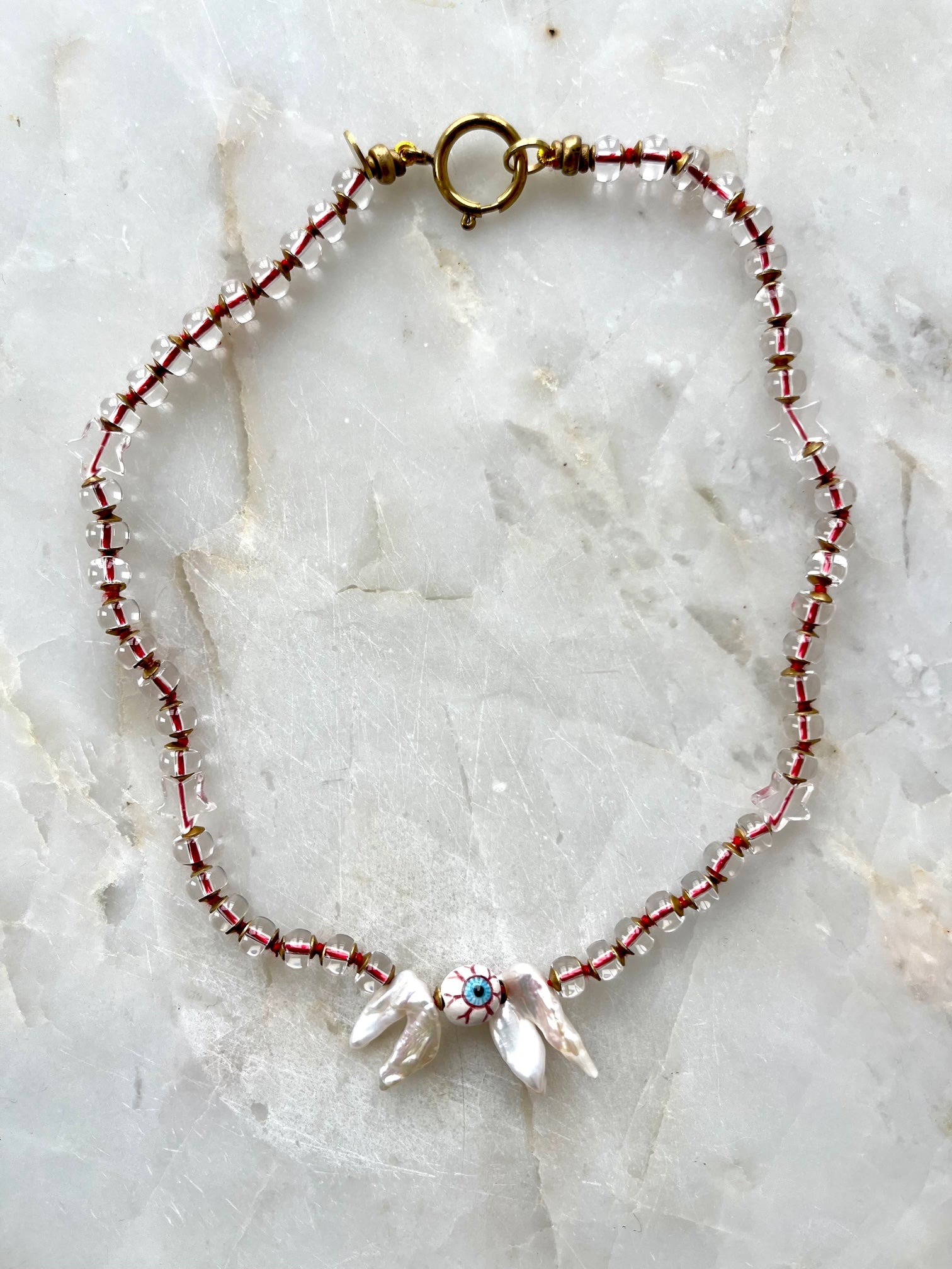 Each necklace measures 16.5" and is composed of fully charged rock crystal and freshwater pearls, all brought together on hand-knotted red silk thread.