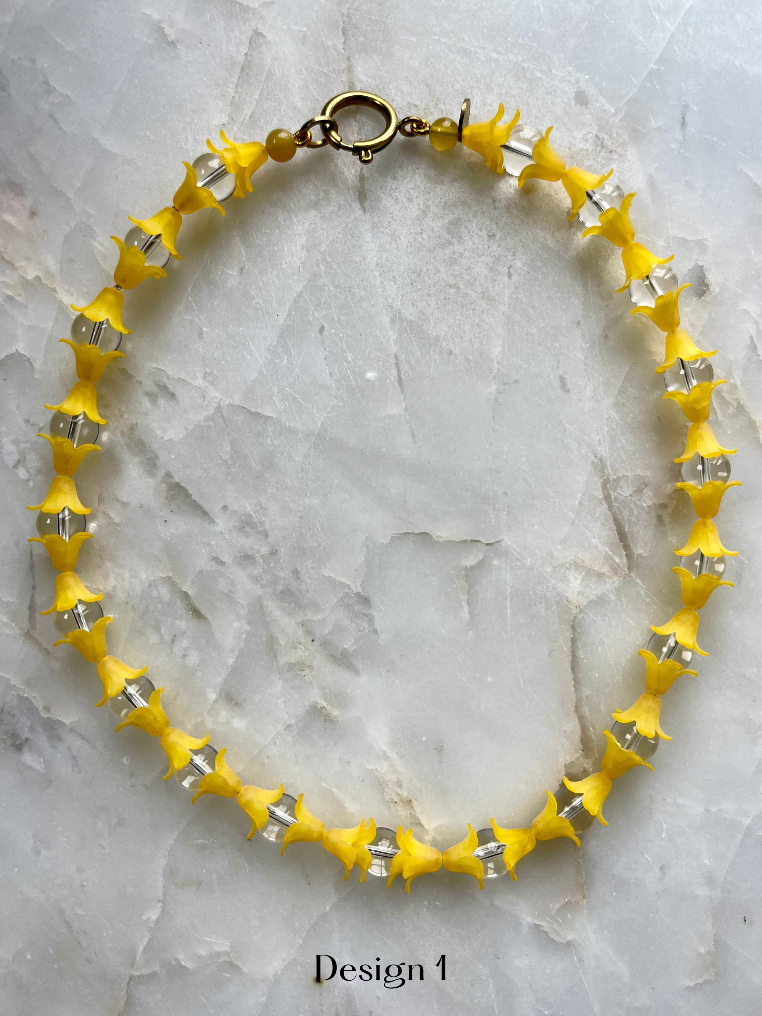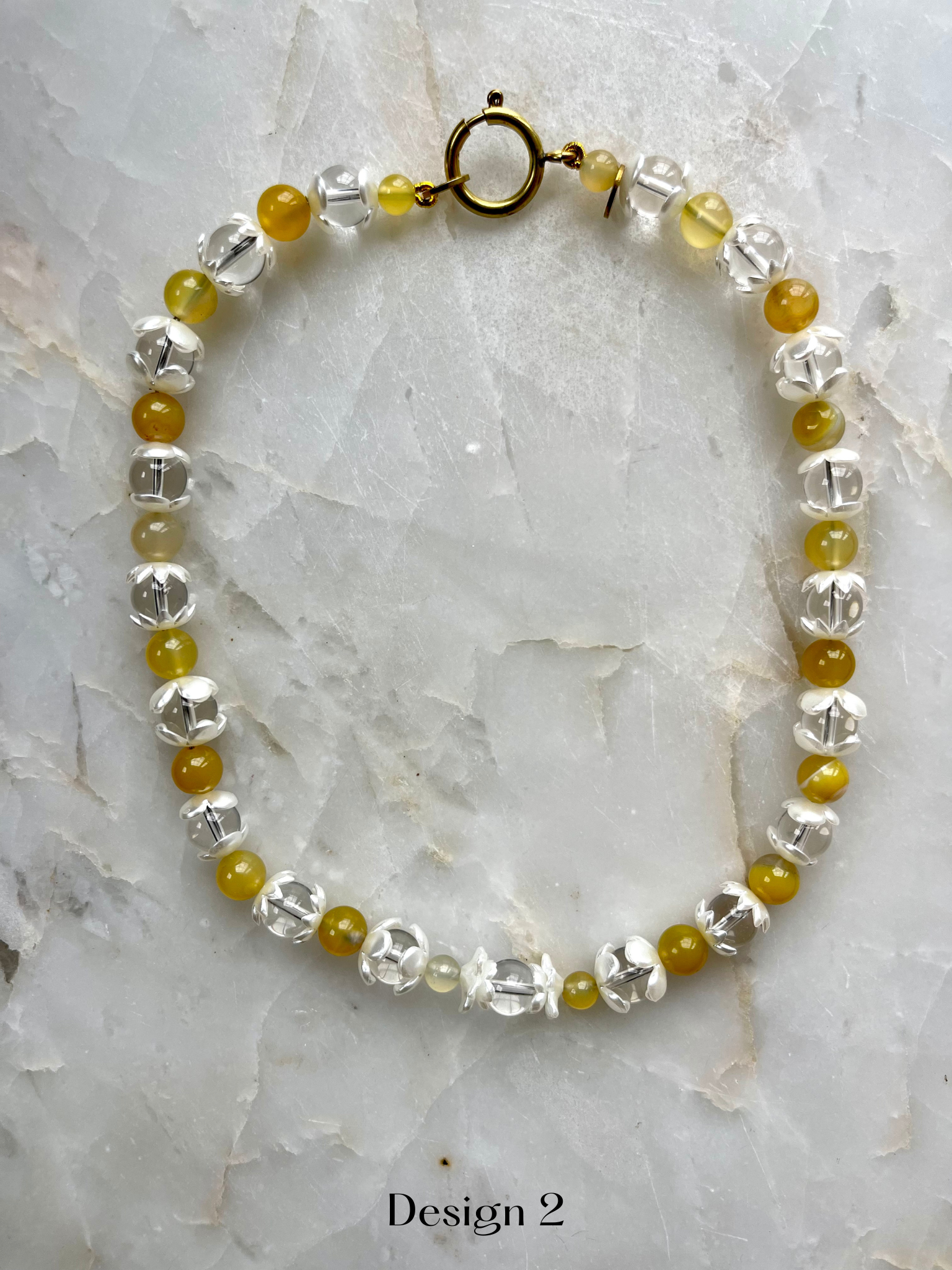 Design #2 measures 16" and is composed of fully charged rock crystal, agate and up-cycled floral beads.