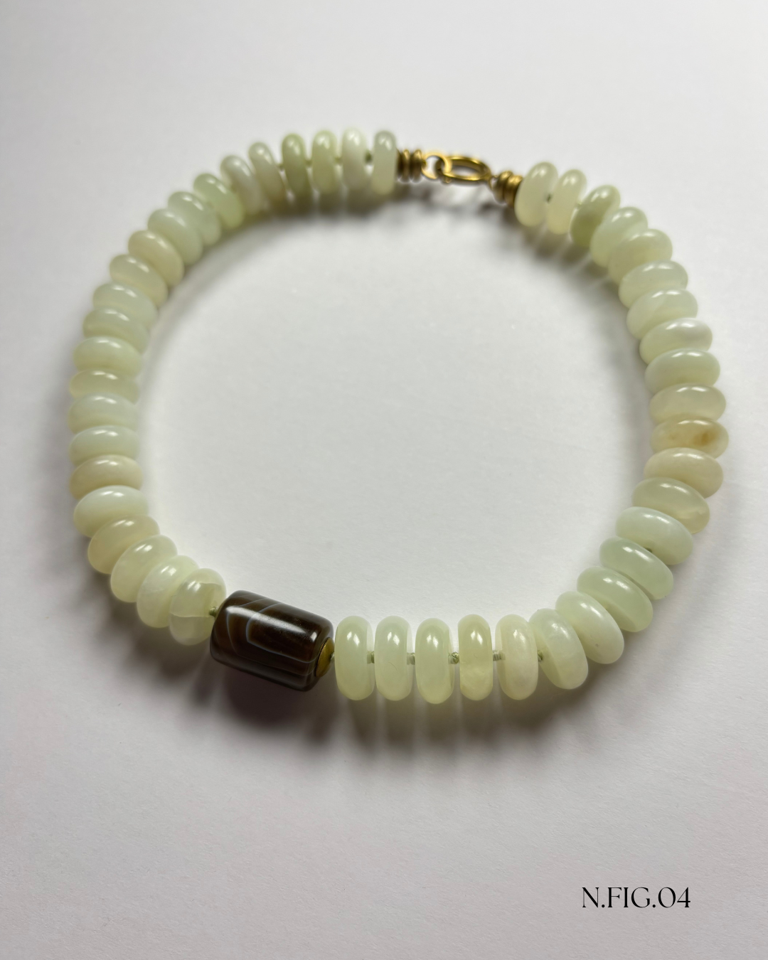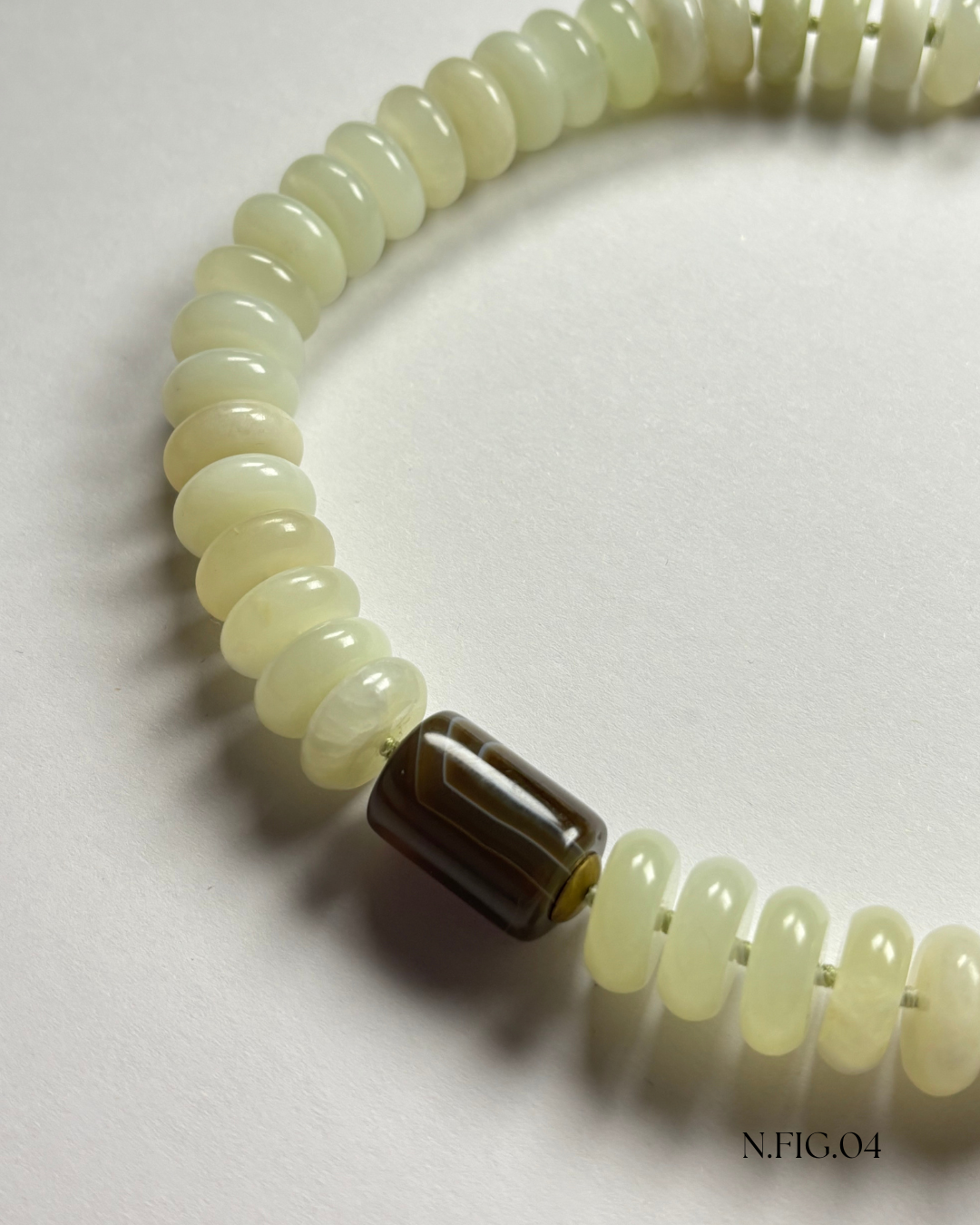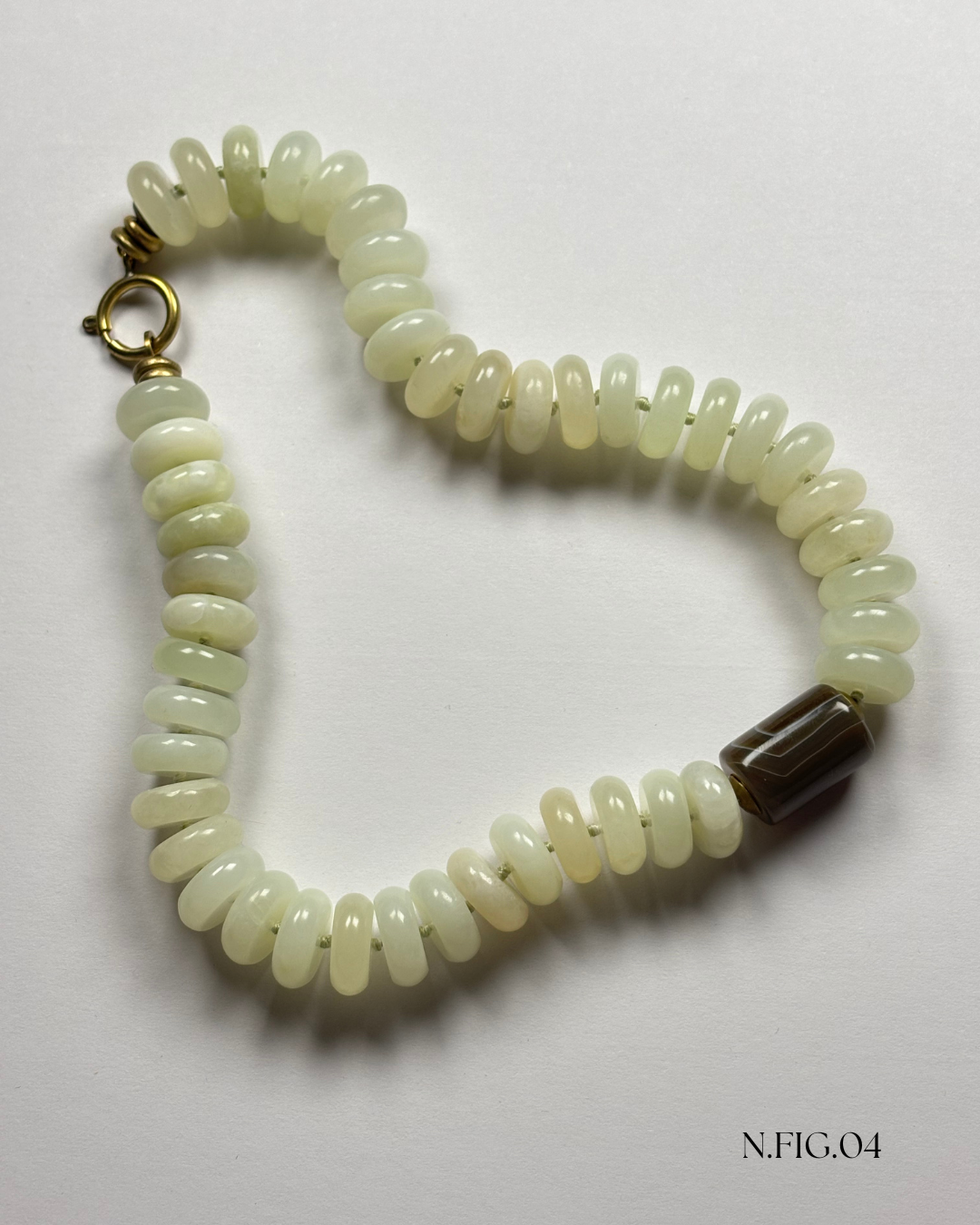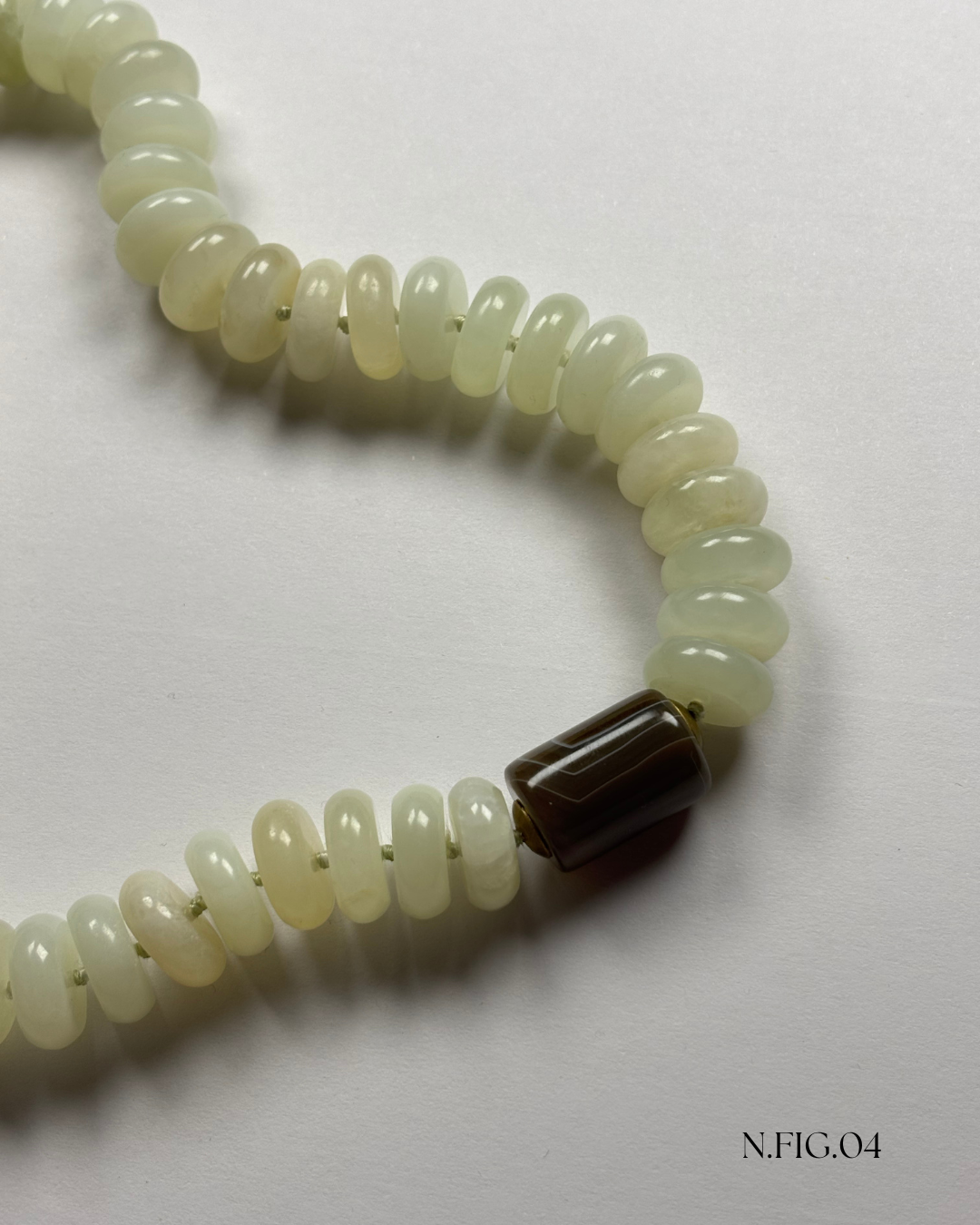 Figure 04 measures 16" and is composed of prehnite and a single grey lace agate beads, all brought together on silk.