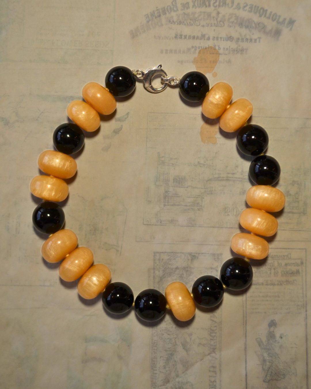 17" necklace crafted with vintage African Amber beads and onyx orbs.
