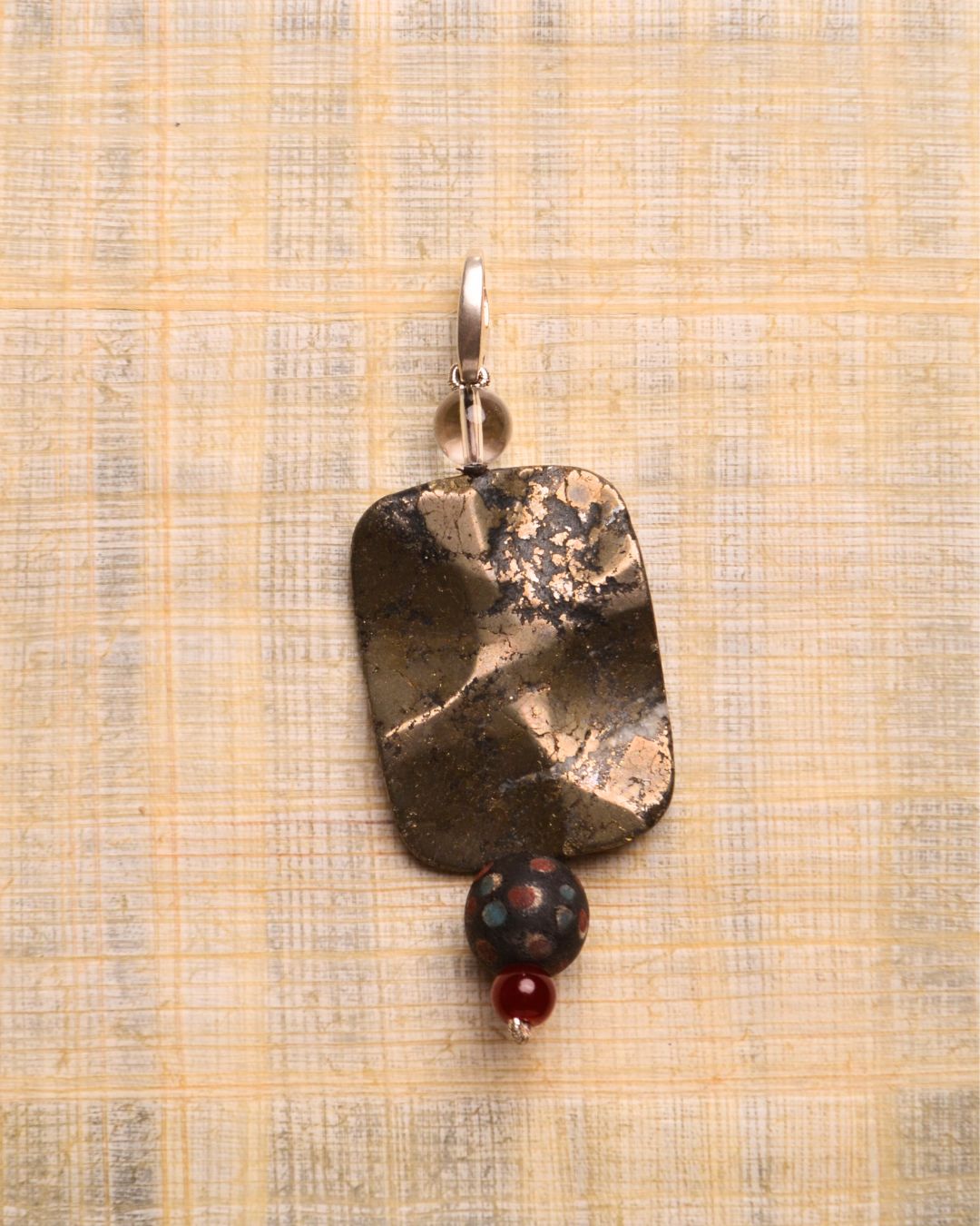 Composed of pyrite, semi-precious stone and ceramic bead with a sterling silver clasp.