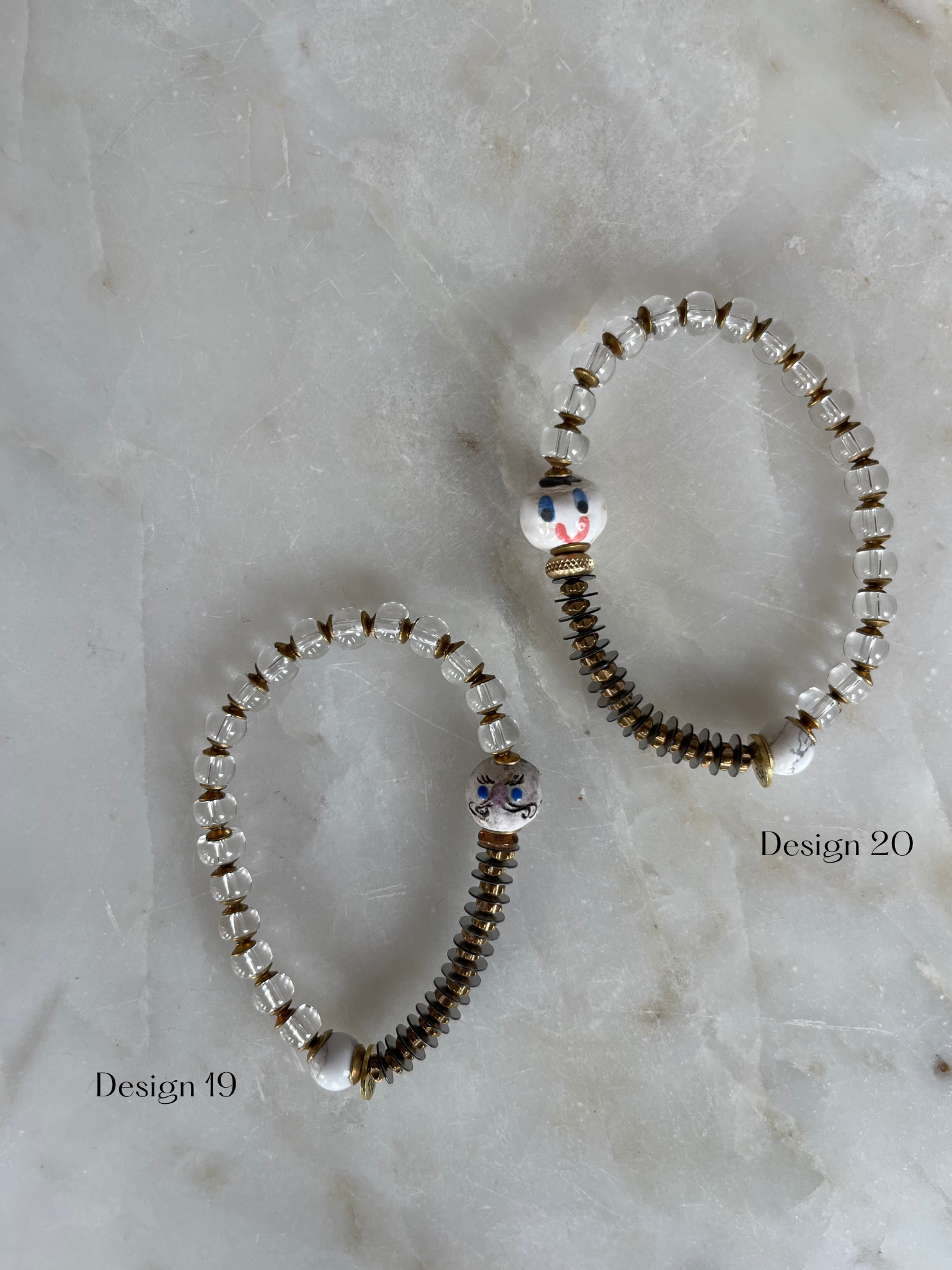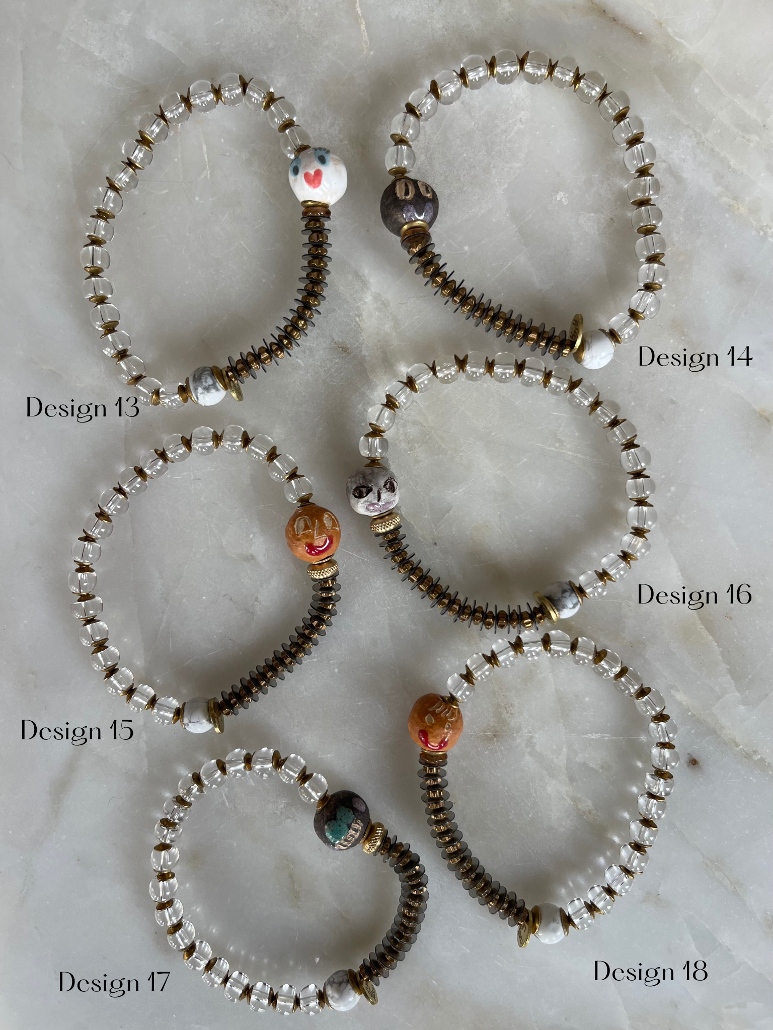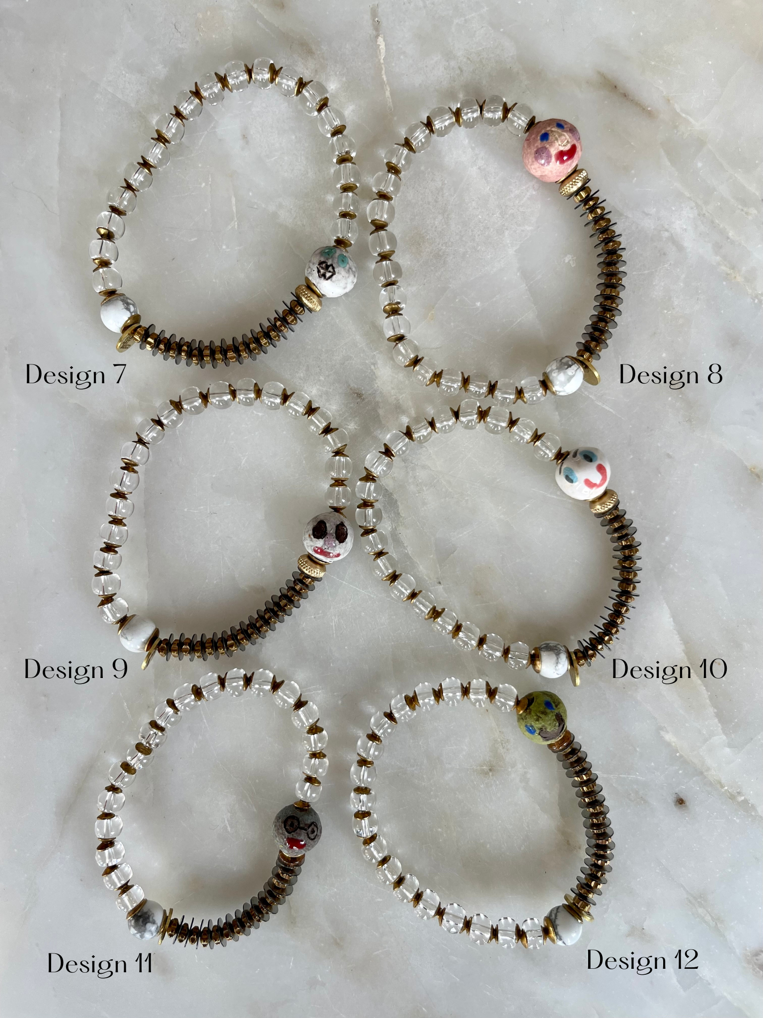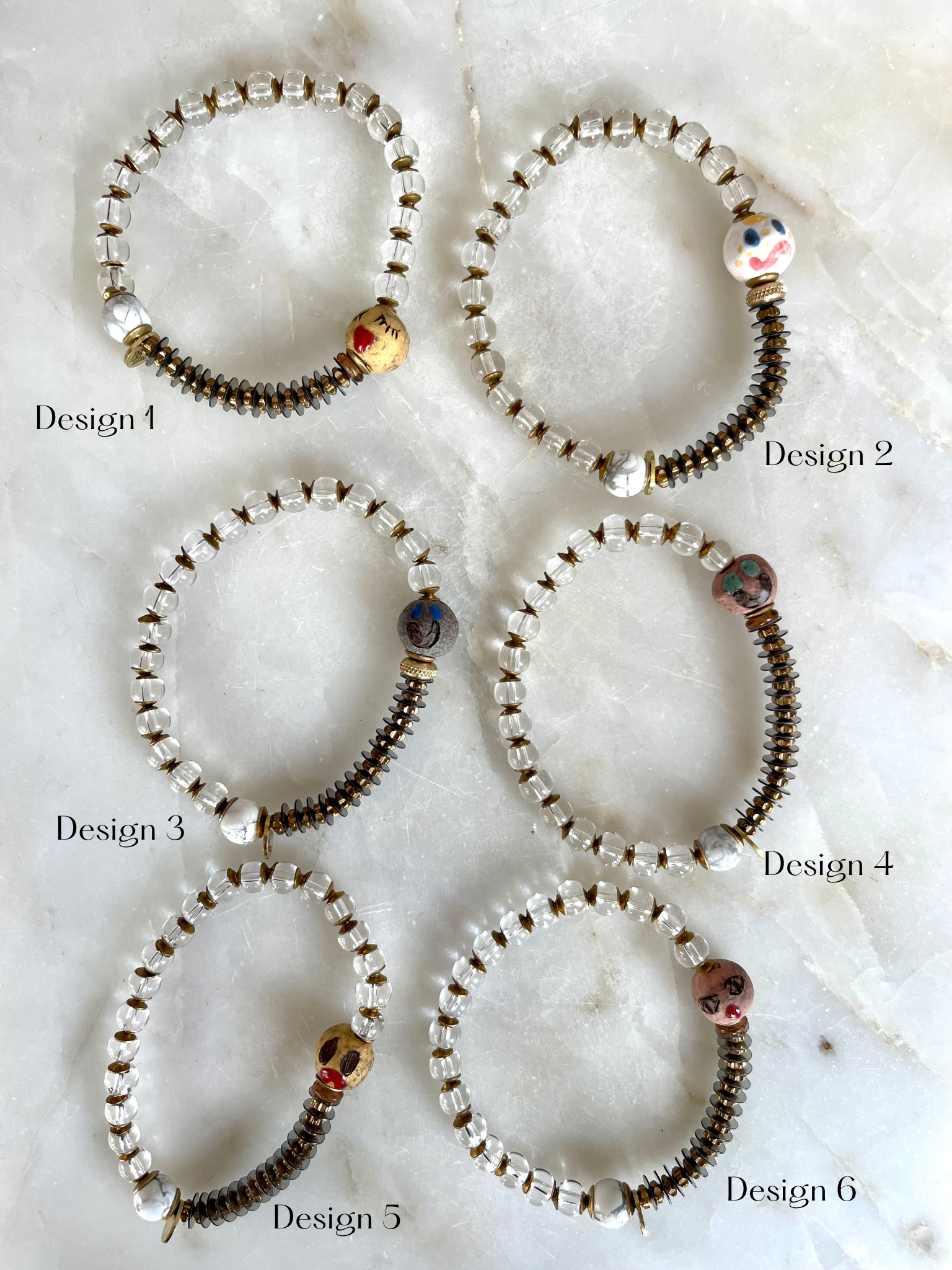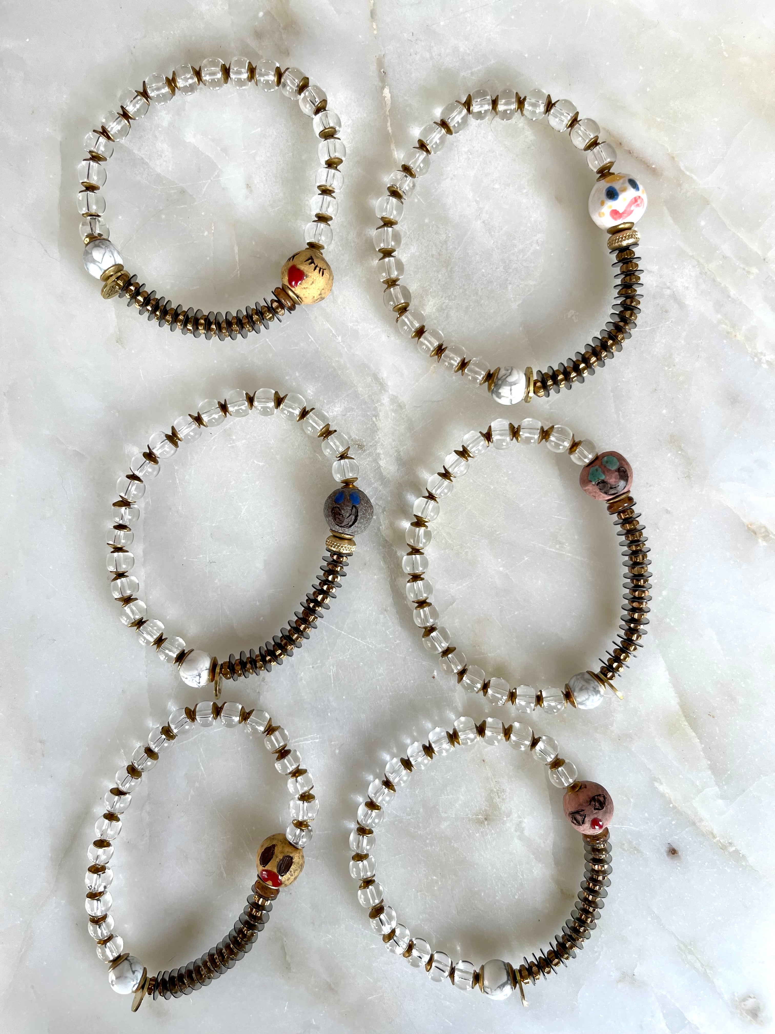 Each bracelet measures 7 inches composed of fully charged rock crystal, handcrafted ceramic face beads and reclaimed brass.