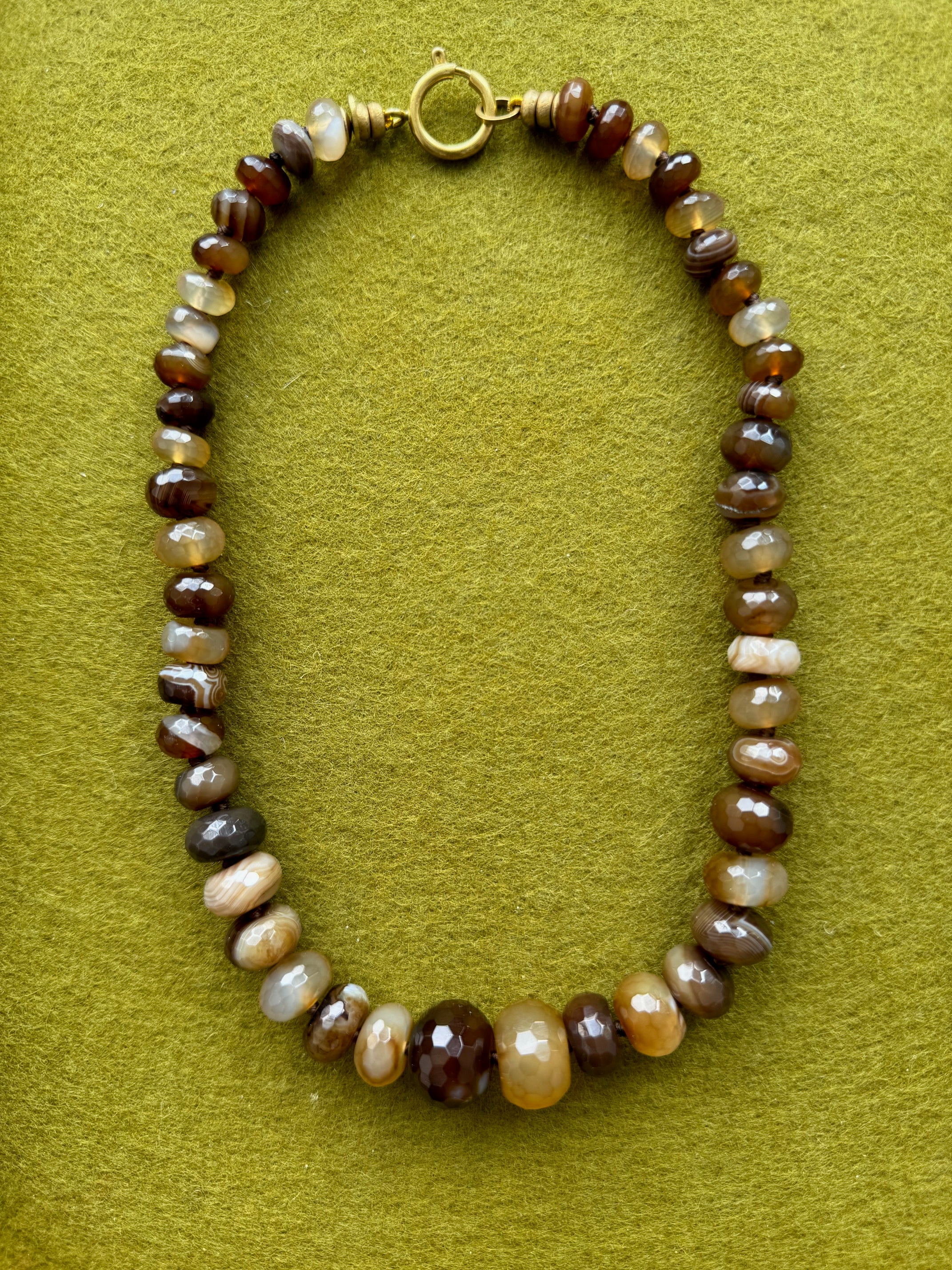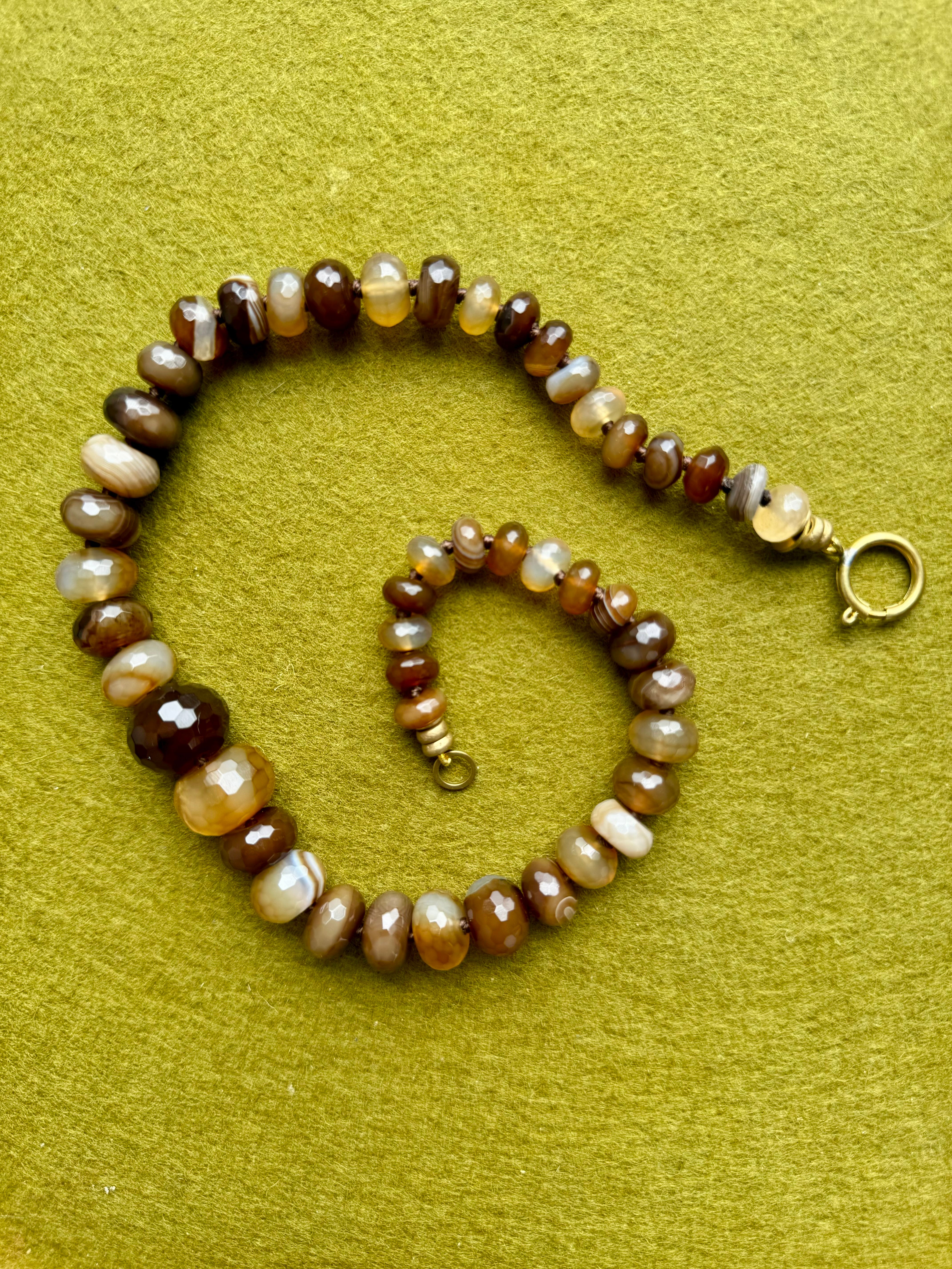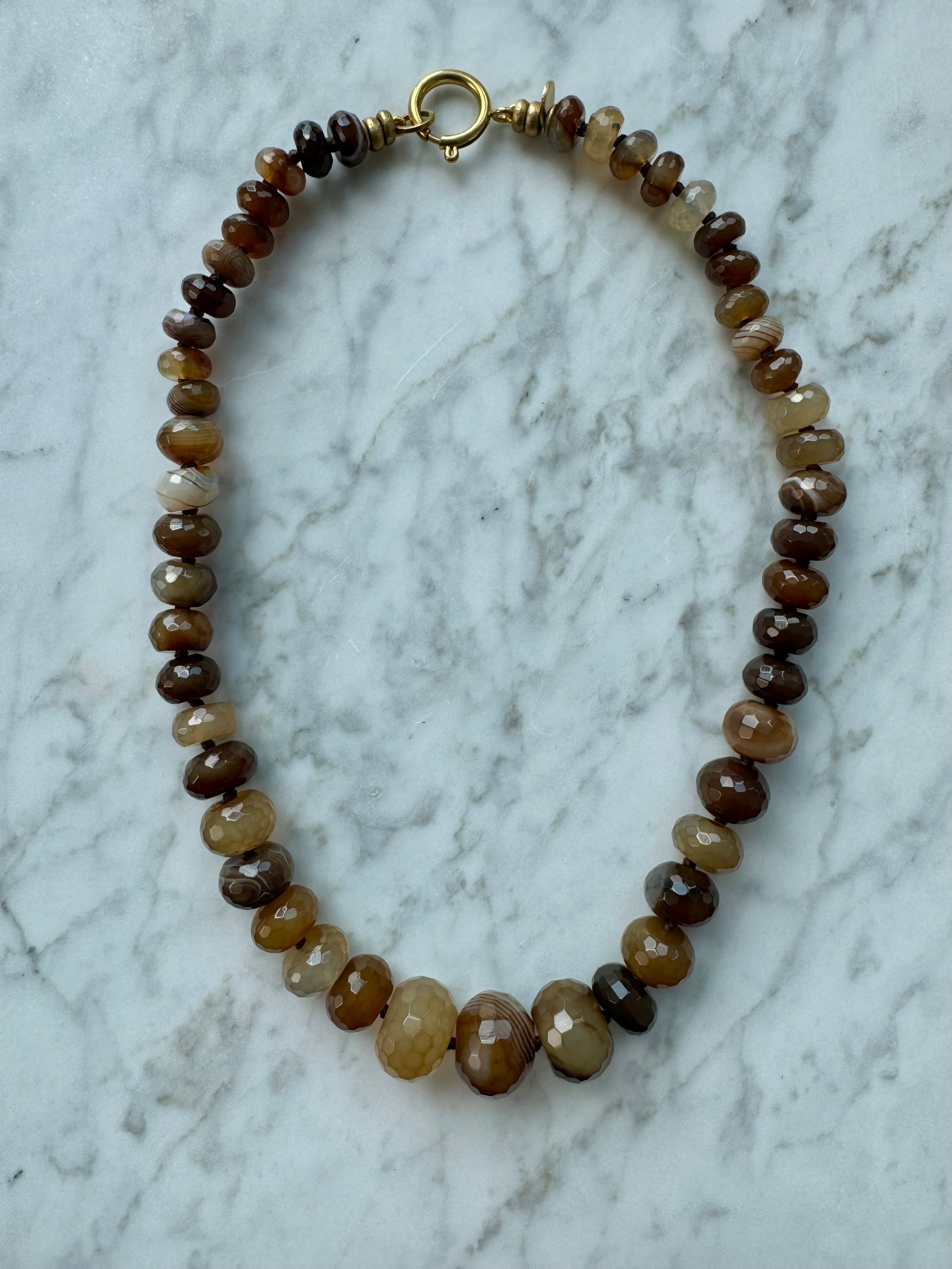 The Chocolate Agate Bonbon necklace measures approximately 18.5" and is strung on silk featuring faceted chocolate chalcedony.