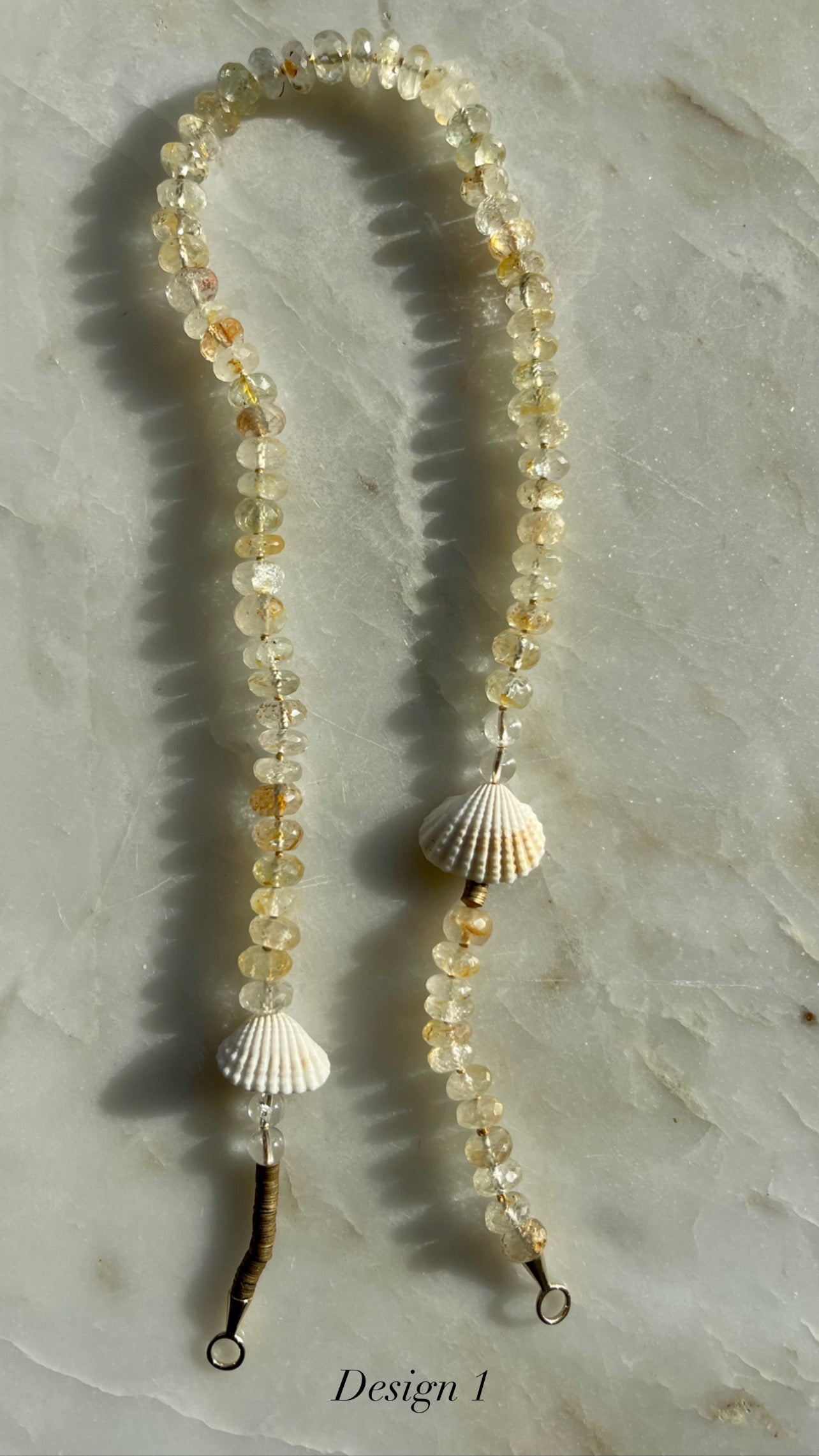 Design 1 measures 19" and is made up of shells, faceted rutilated quartz hand knotted with silk and finished with 9K yg findings
