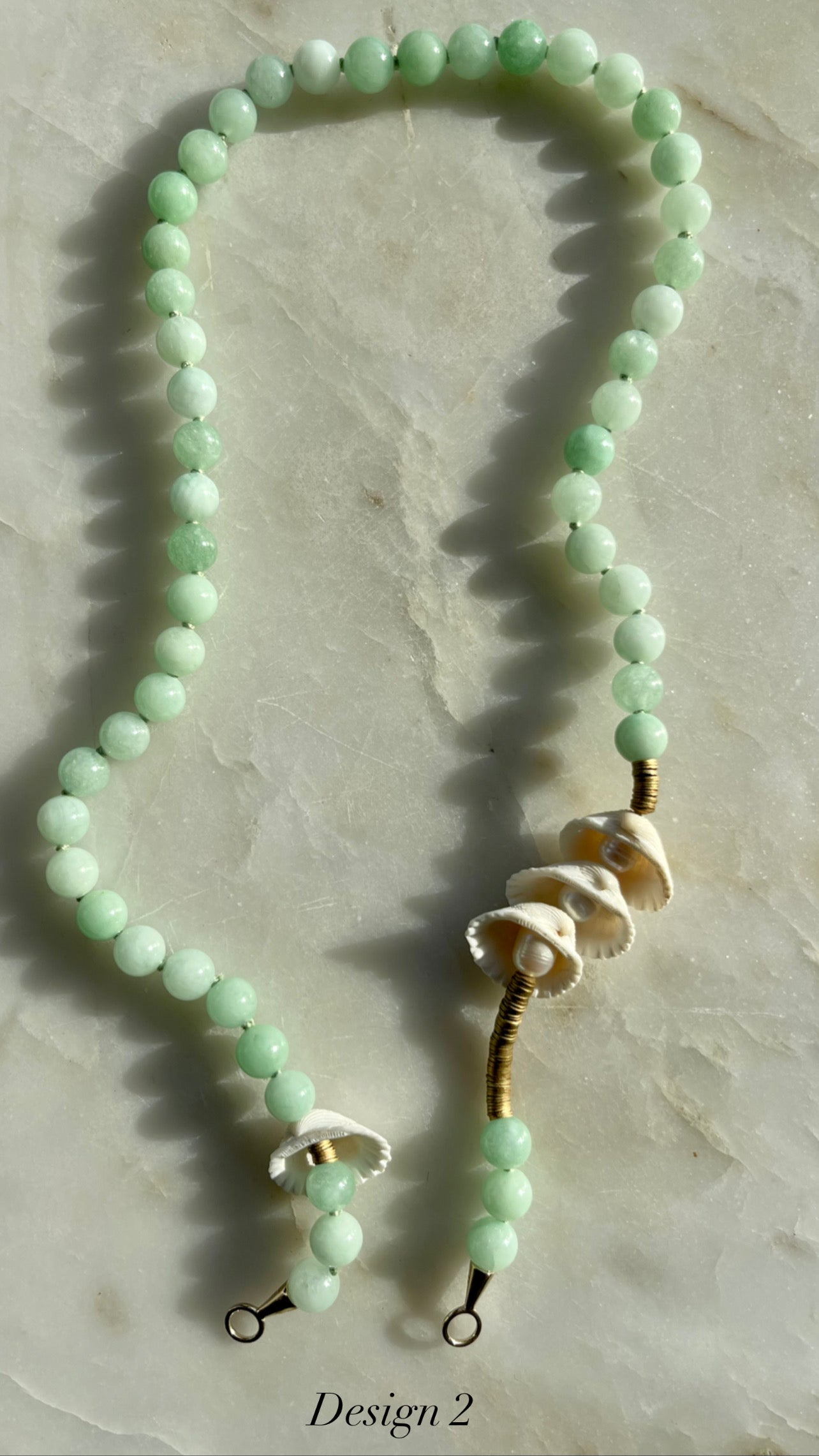 Design 2 measures 21.5" and is made up of shells, recycled brass and aventurine rounds hand knotted with silk and finished with 9K yg findings