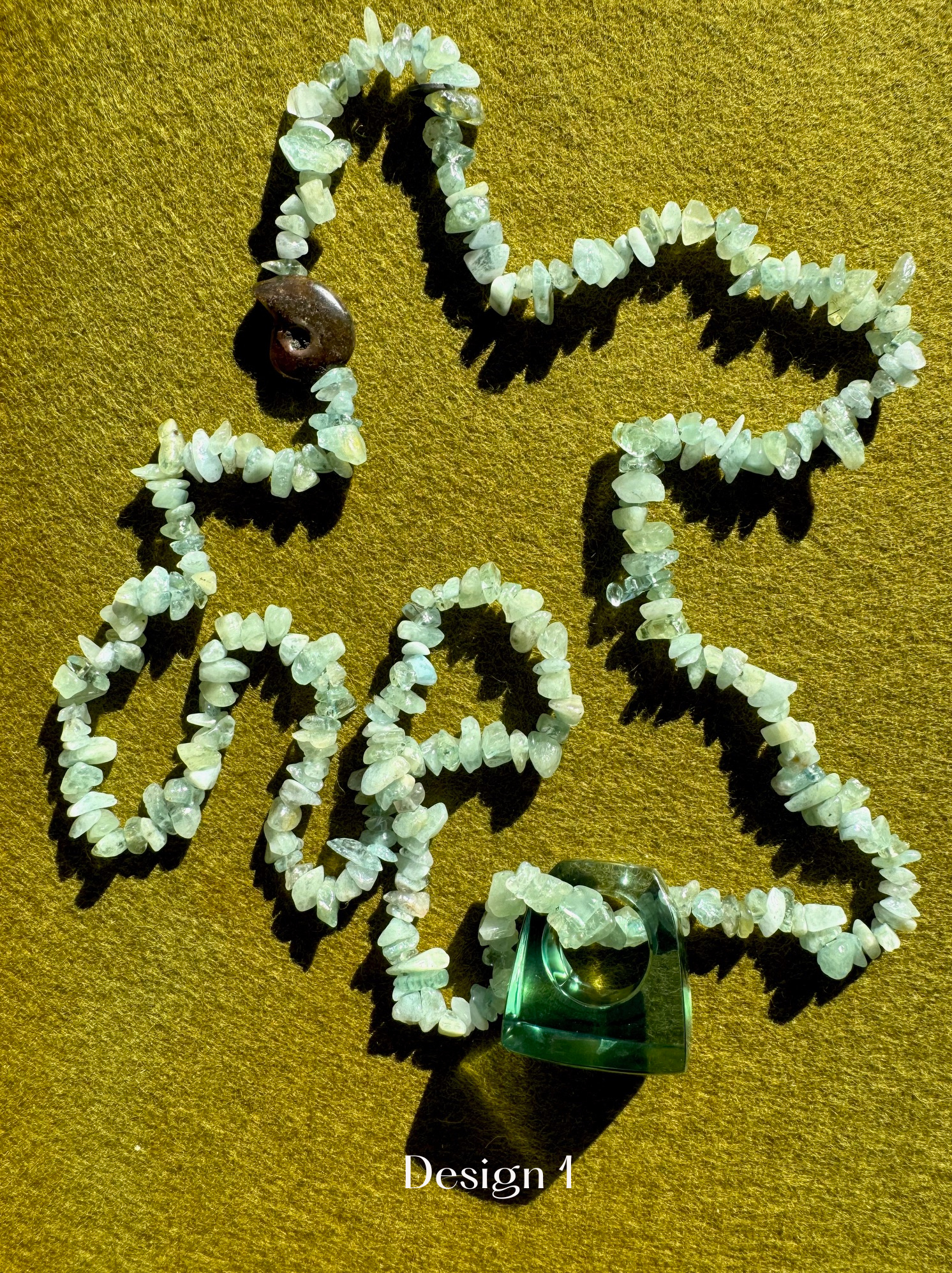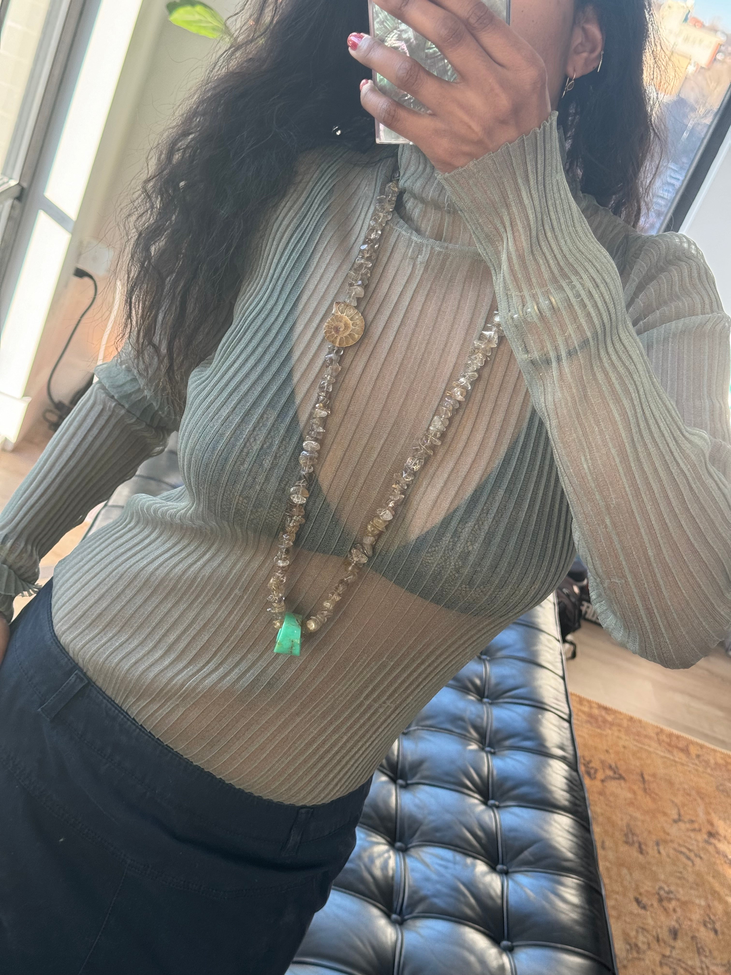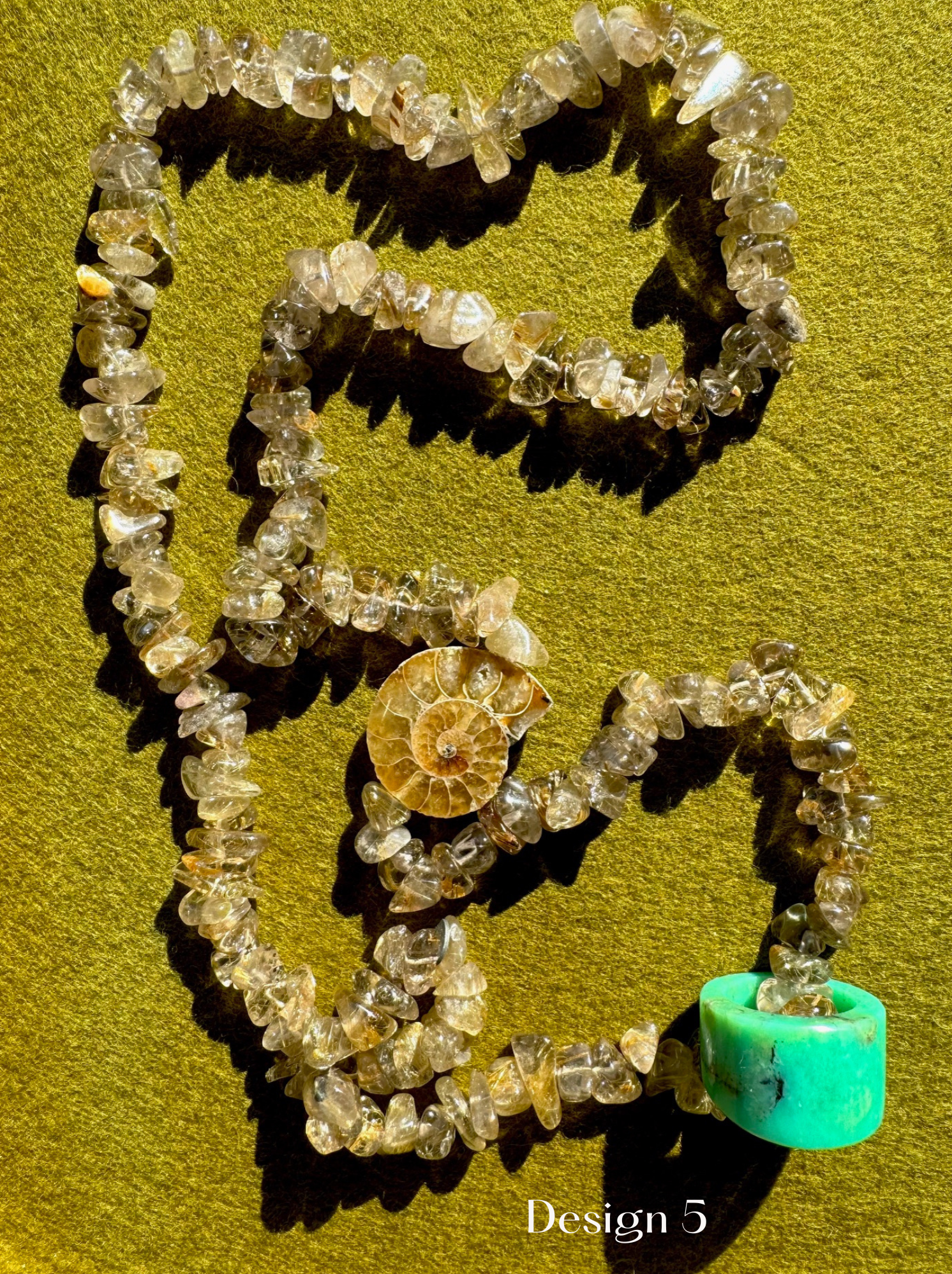 Each necklace measures approximately 30" and is composed of a hand carved semi-precious stone ring and organically shaped semi-precious stones (onyx, rutilated quartz, jade, aquamarine, coral) and ammonite all brought together on silk thread.