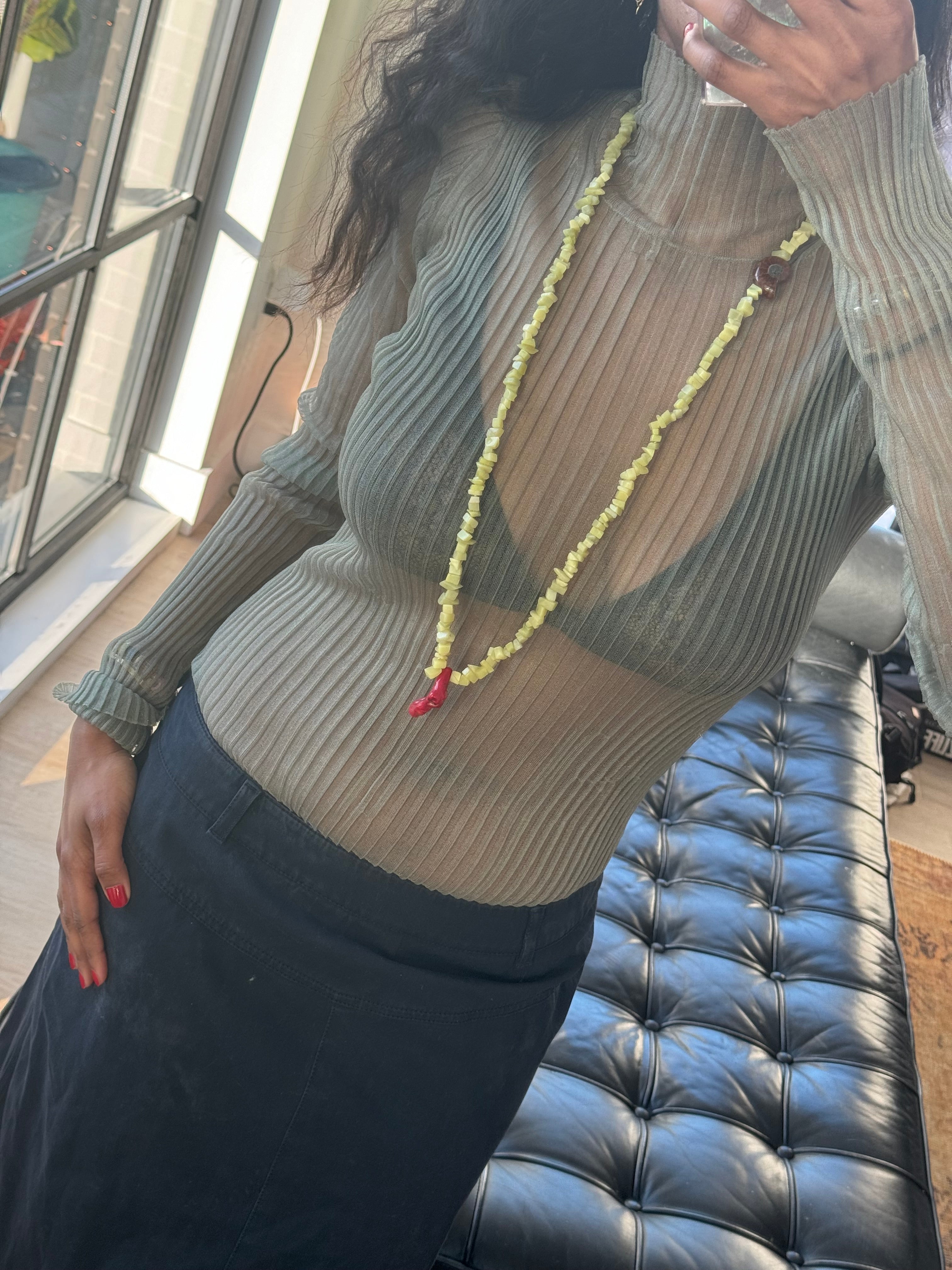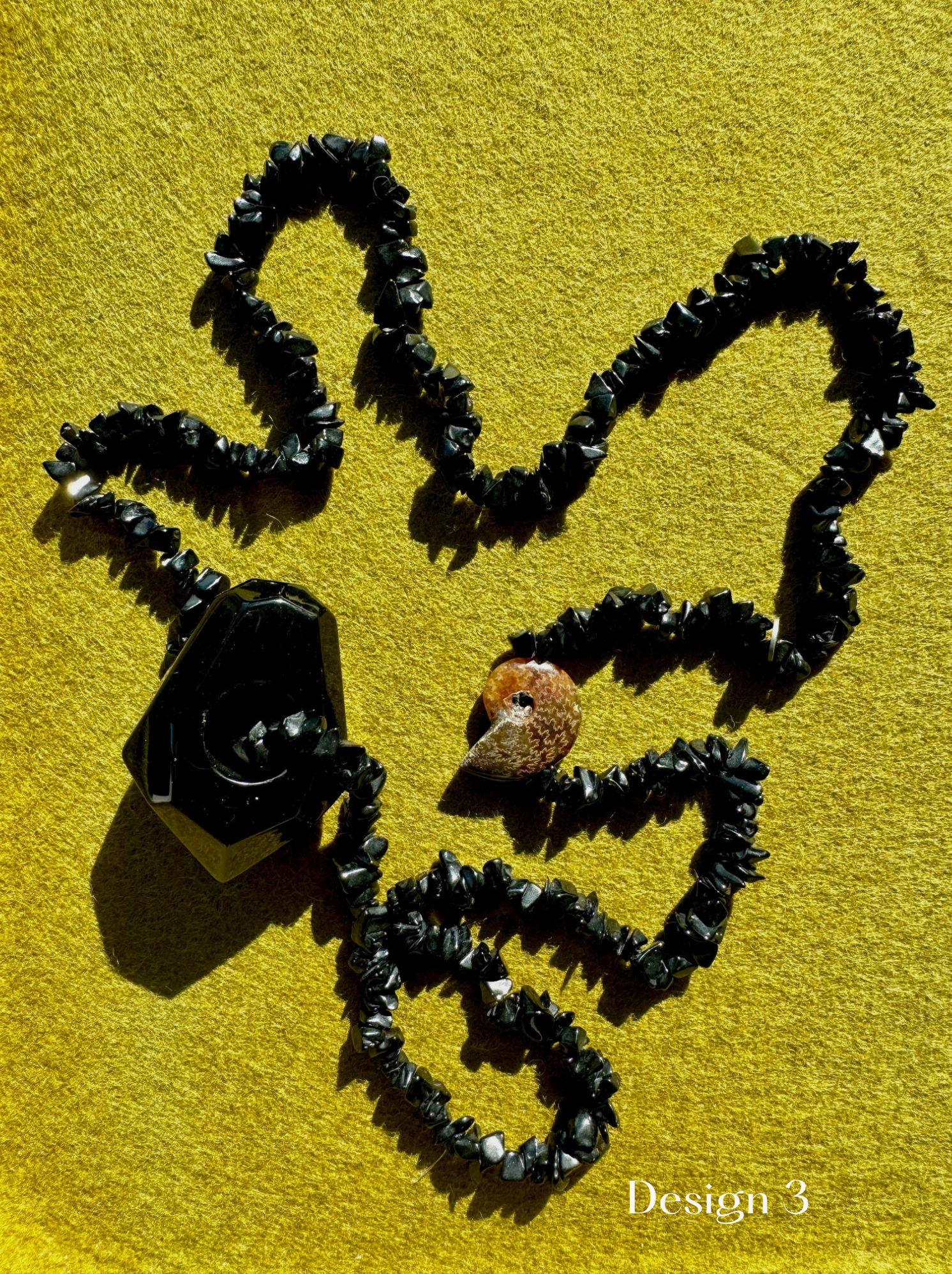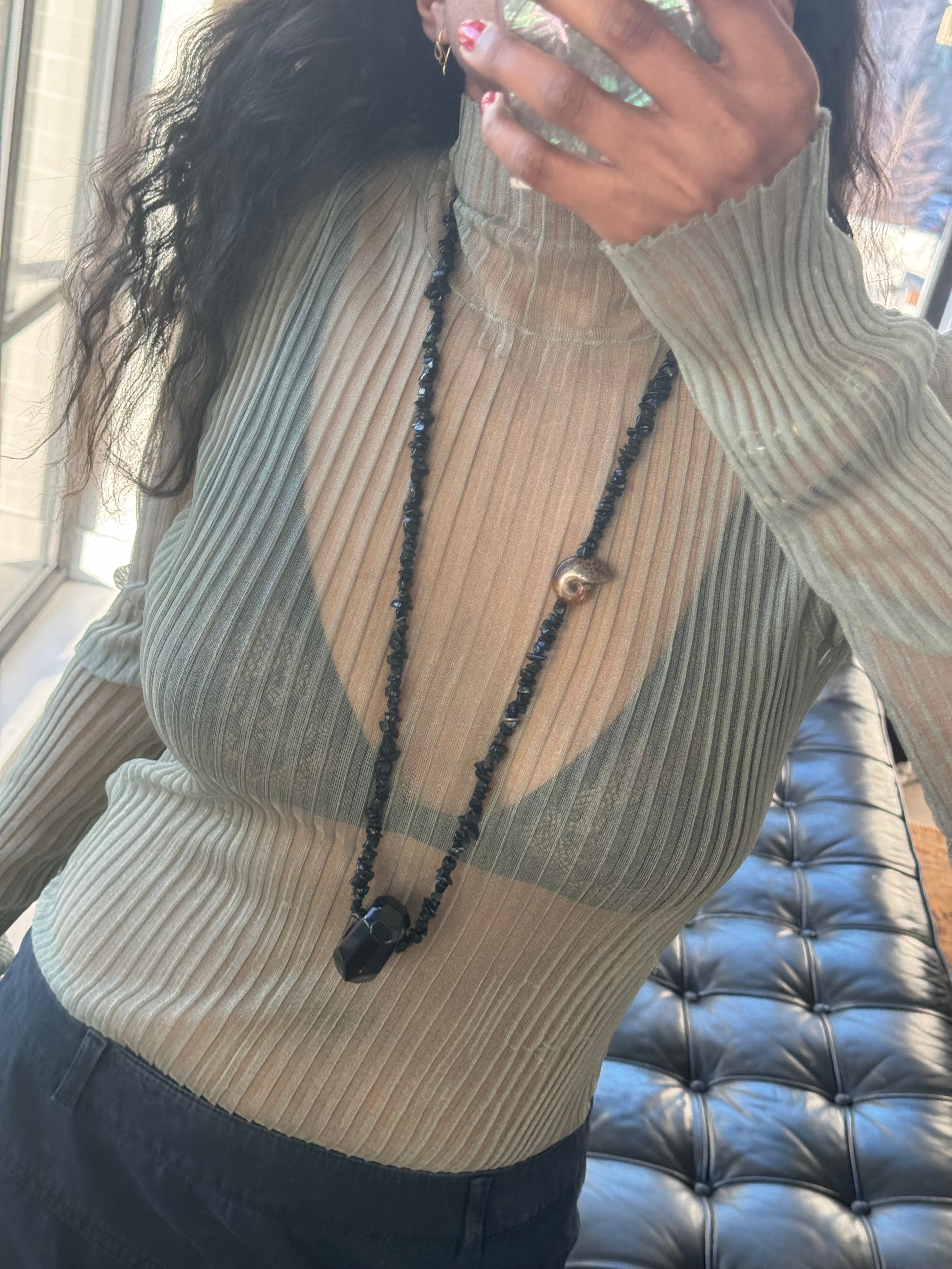 Each necklace measures approximately 30" and is composed of a hand carved semi-precious stone ring and organically shaped semi-precious stones (onyx, rutilated quartz, jade, aquamarine, coral) and ammonite all brought together on silk thread.
