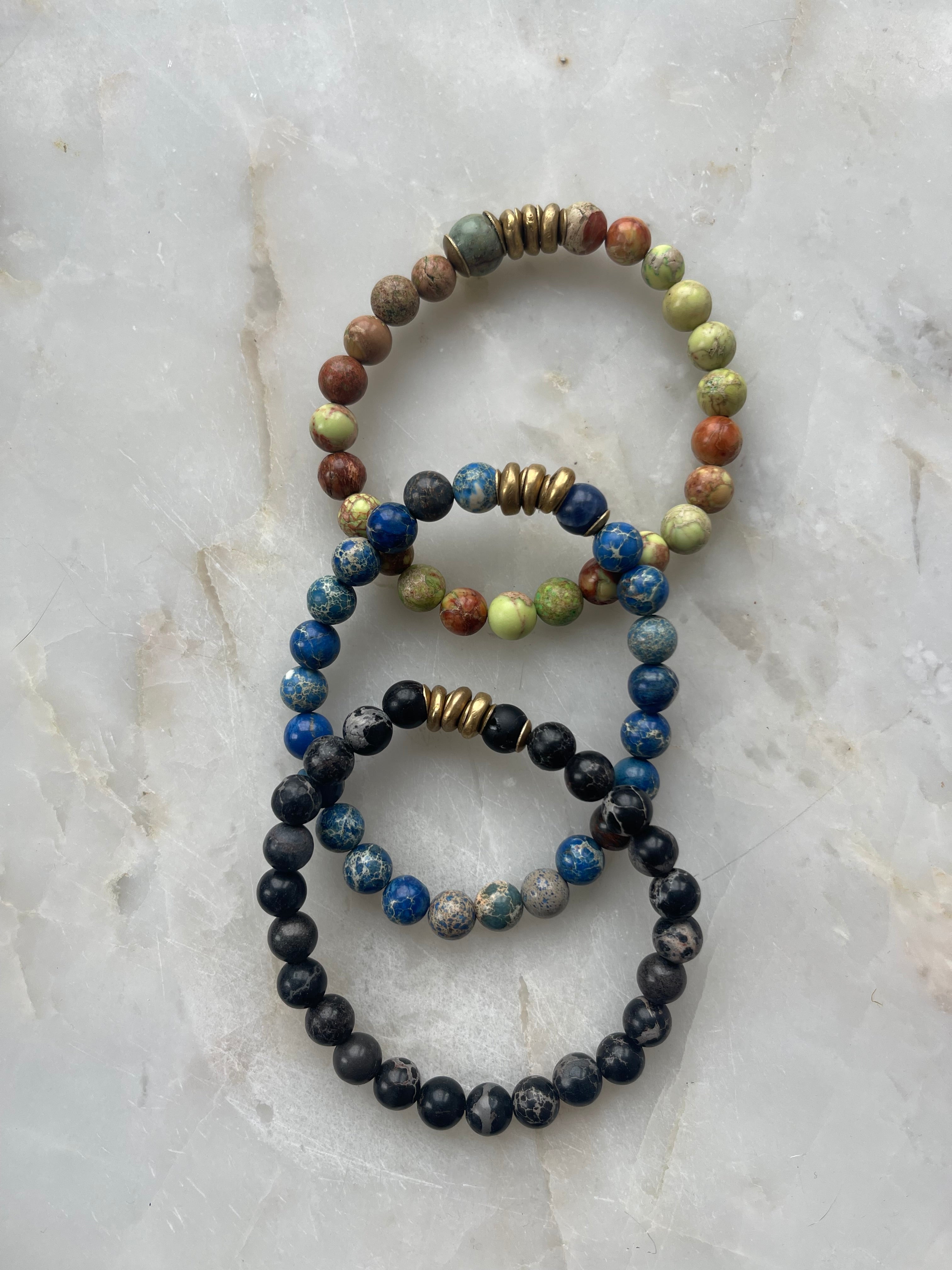 All the bracelets measure 8 inches are made with sea sediment and recycled brass