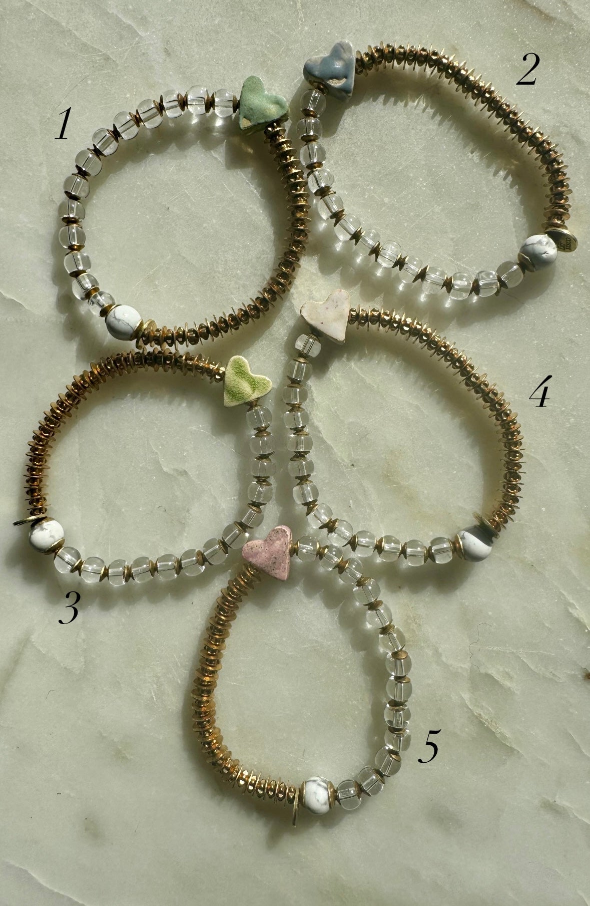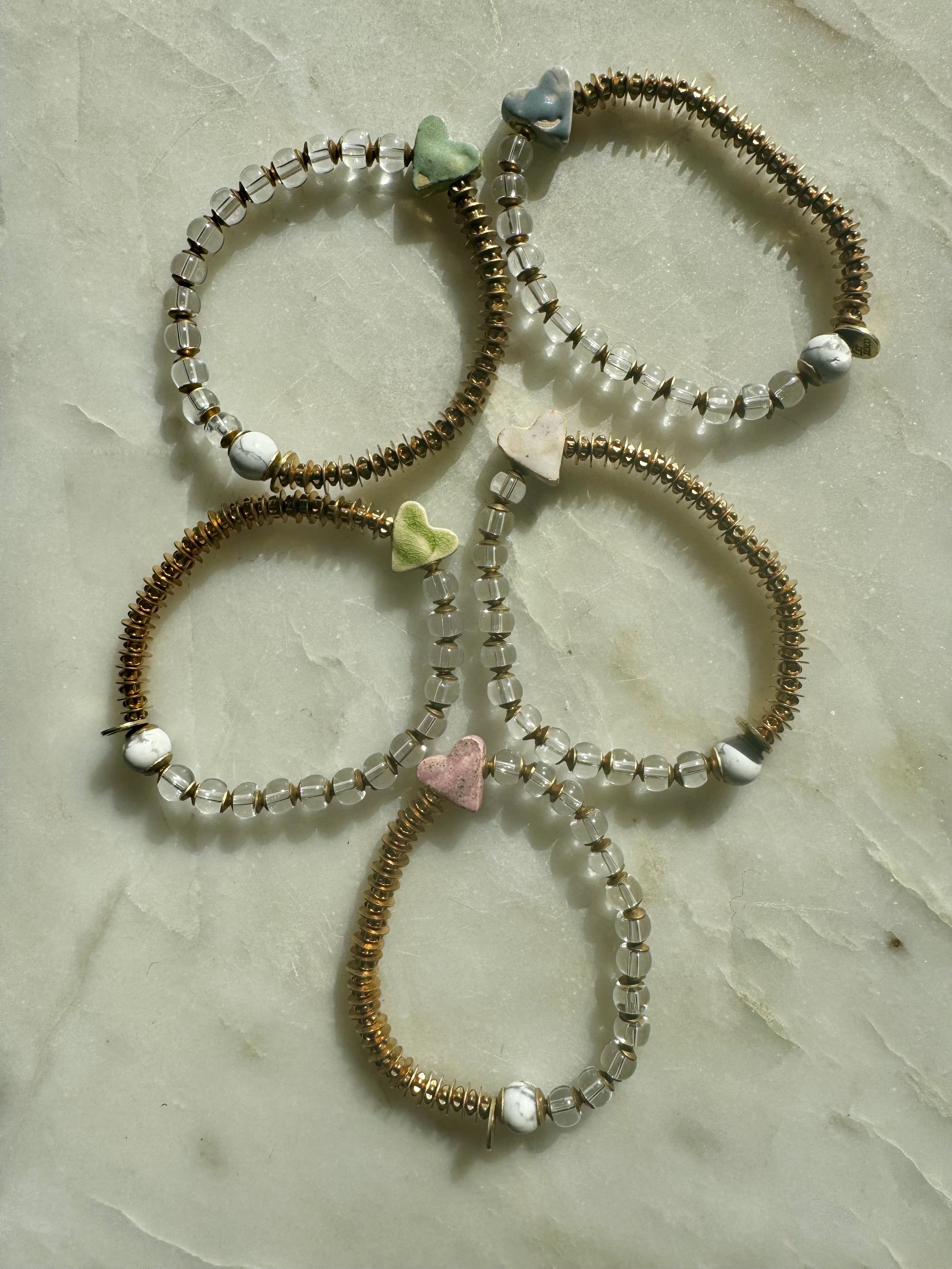 Each bracelet measures 7" and are composed of rock crystal, clay and recycled brass,