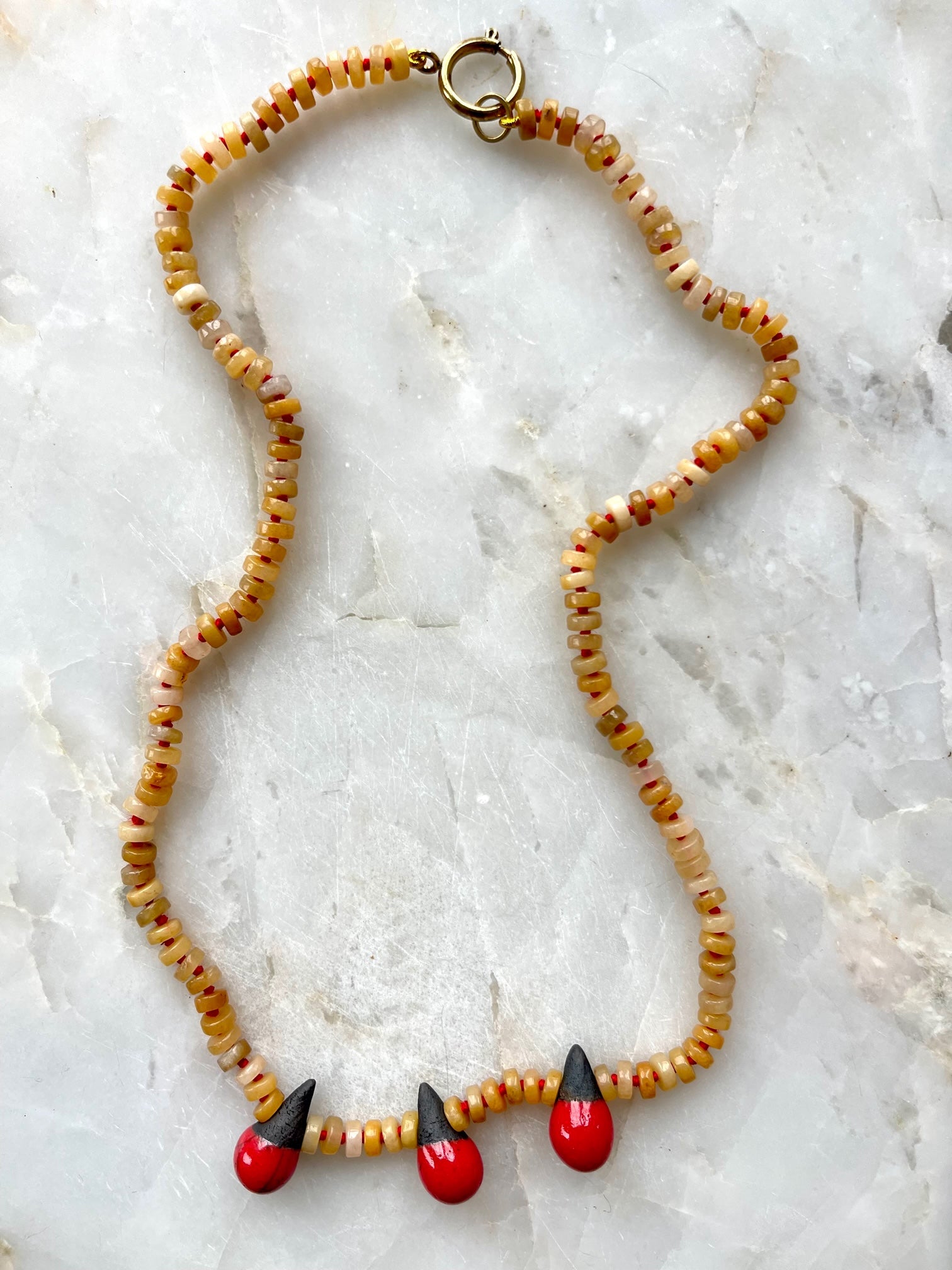 Each necklace measures 22" and is composed yellow jade and handcrafted ceramic charms, all brought together on hand-knotted silk thread.