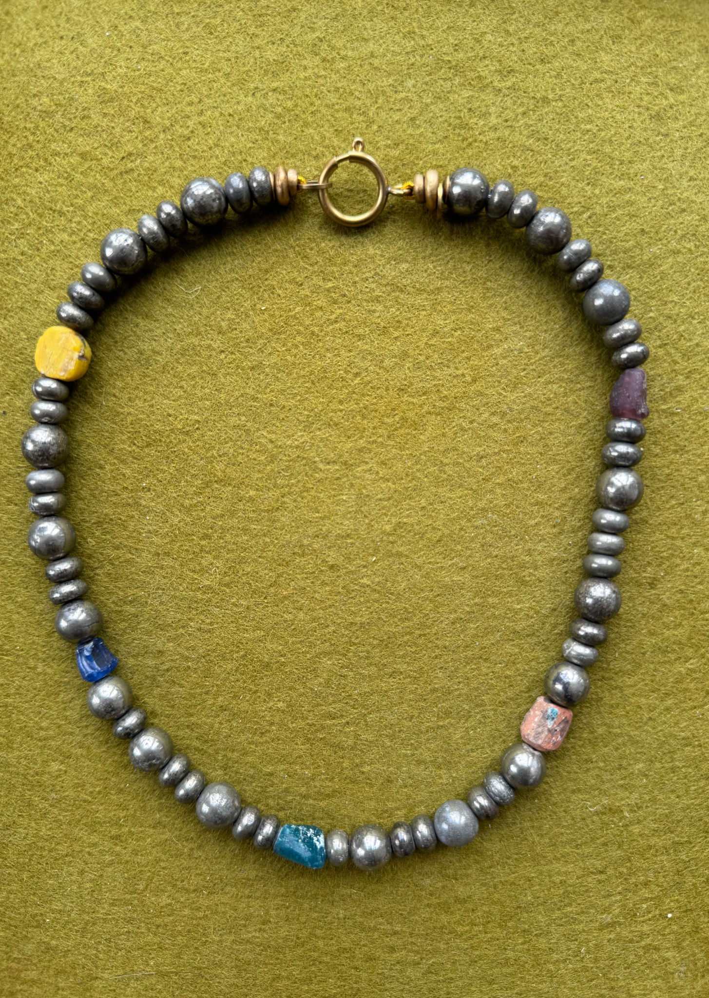 The Retro Refraction Rhapsody necklace measures approximately 17" and is composed of pyrite and aged glass.