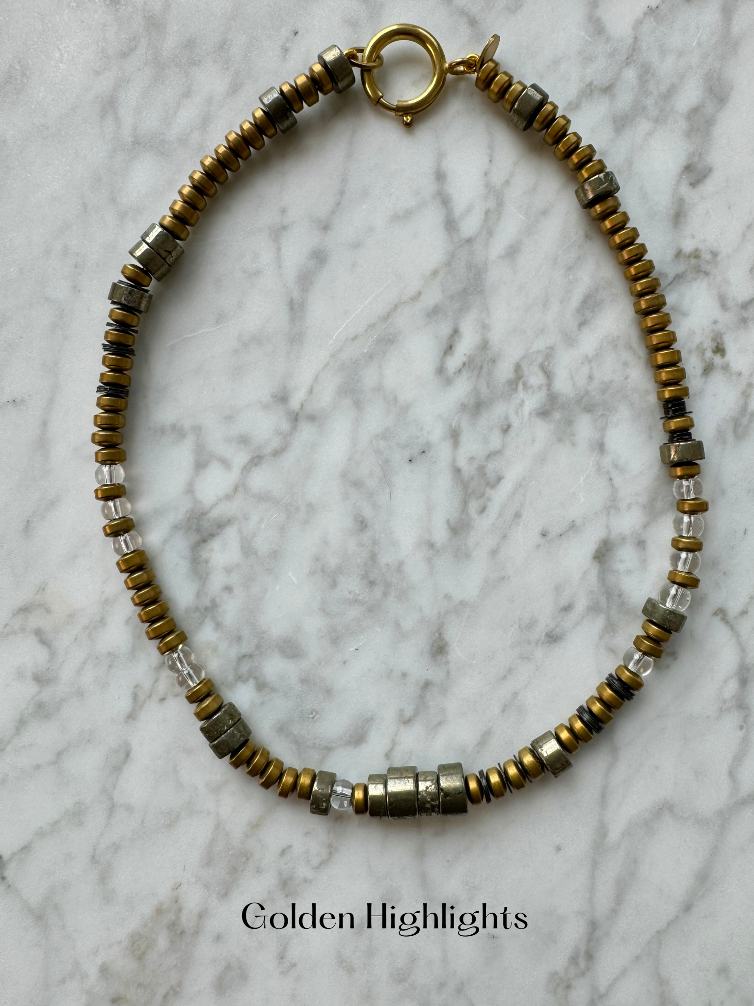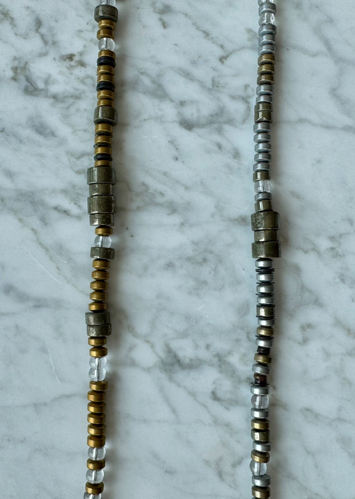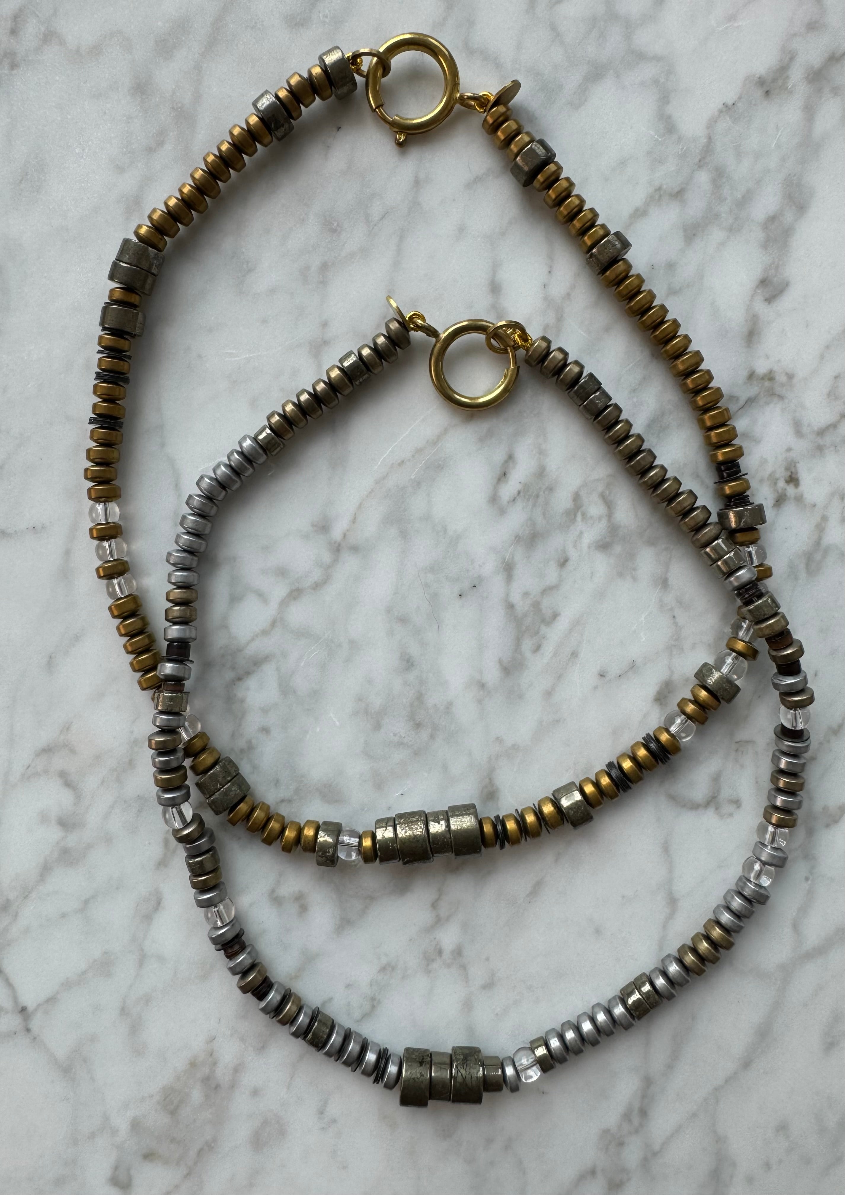 Each necklace measures approximately 17" and is composed of fully charged rock crystal and ranging shades of white and gold Pyrite.