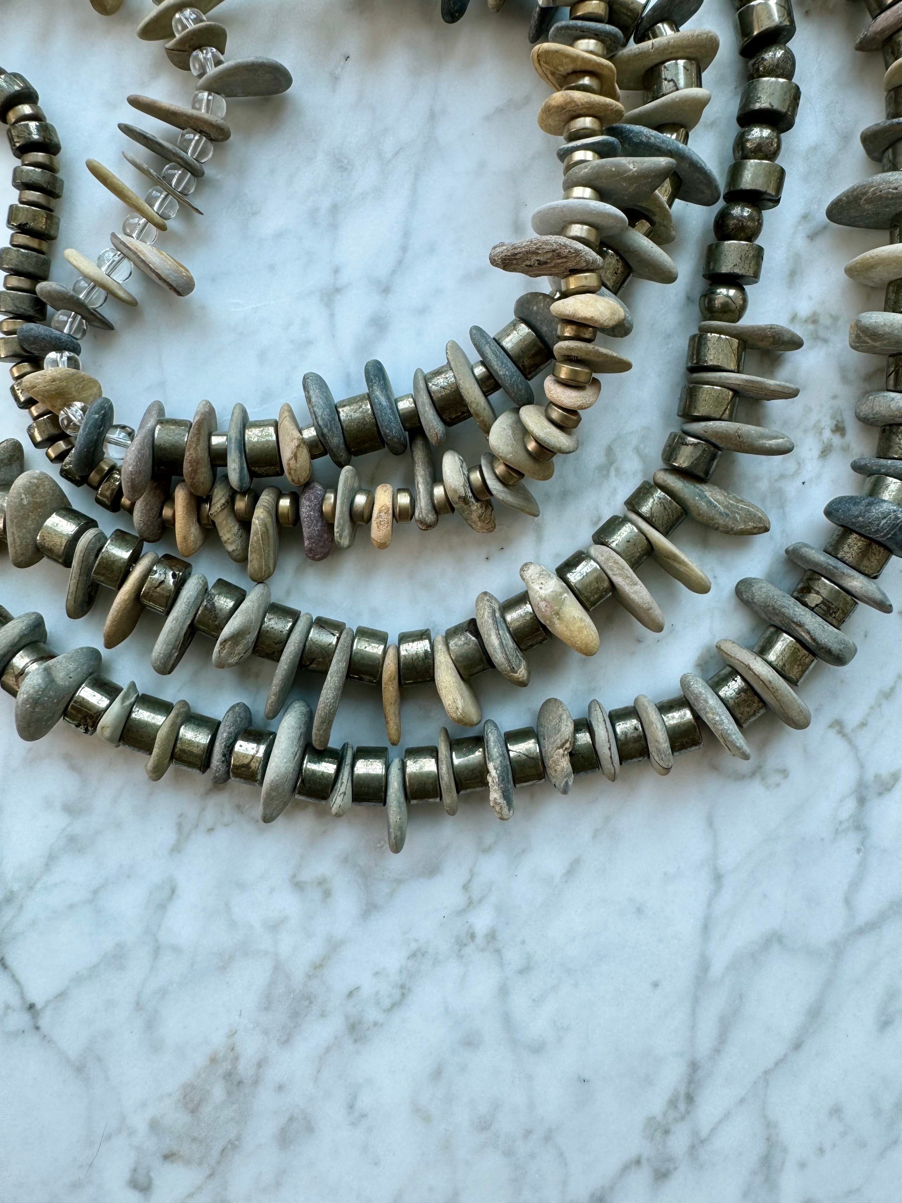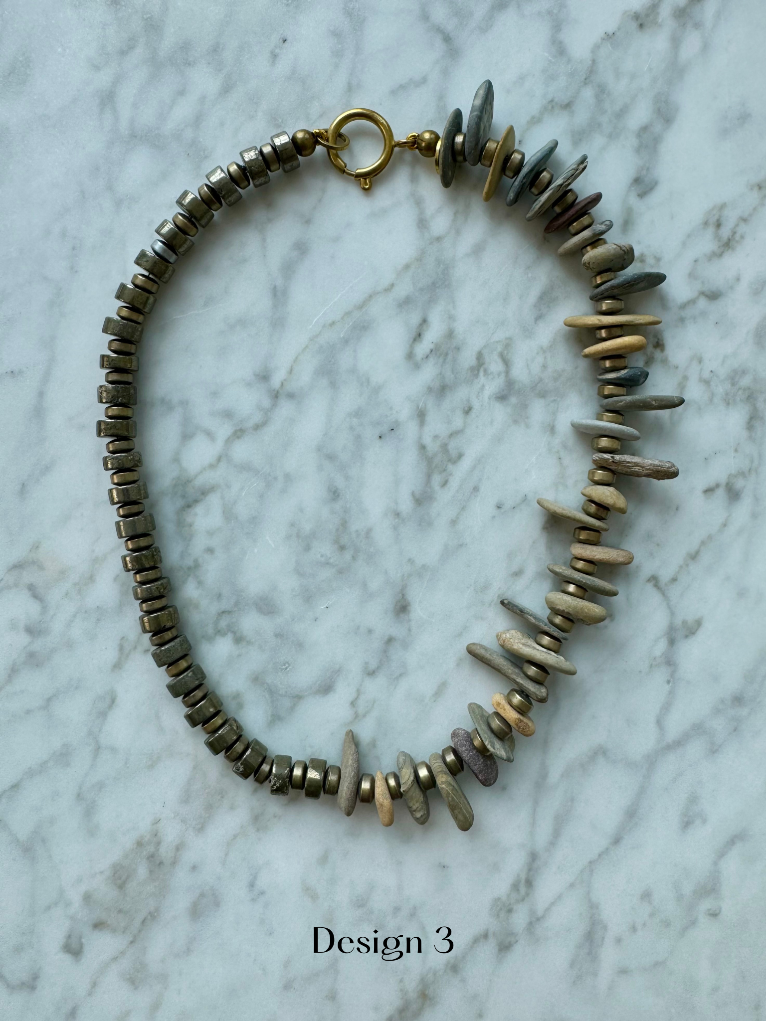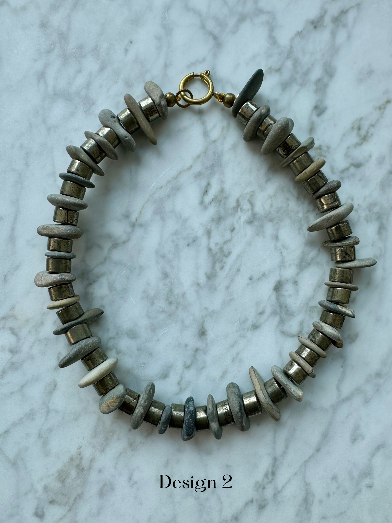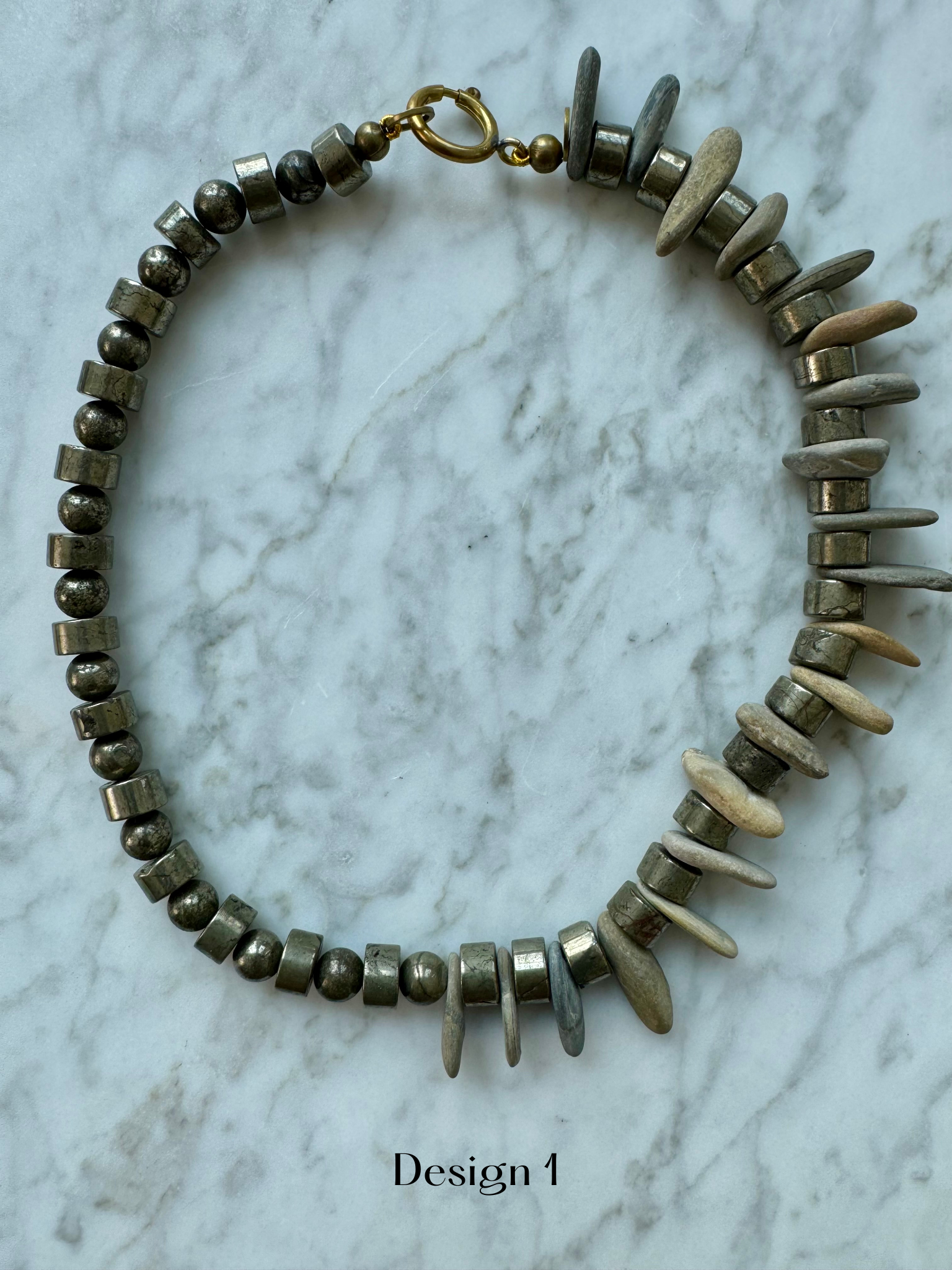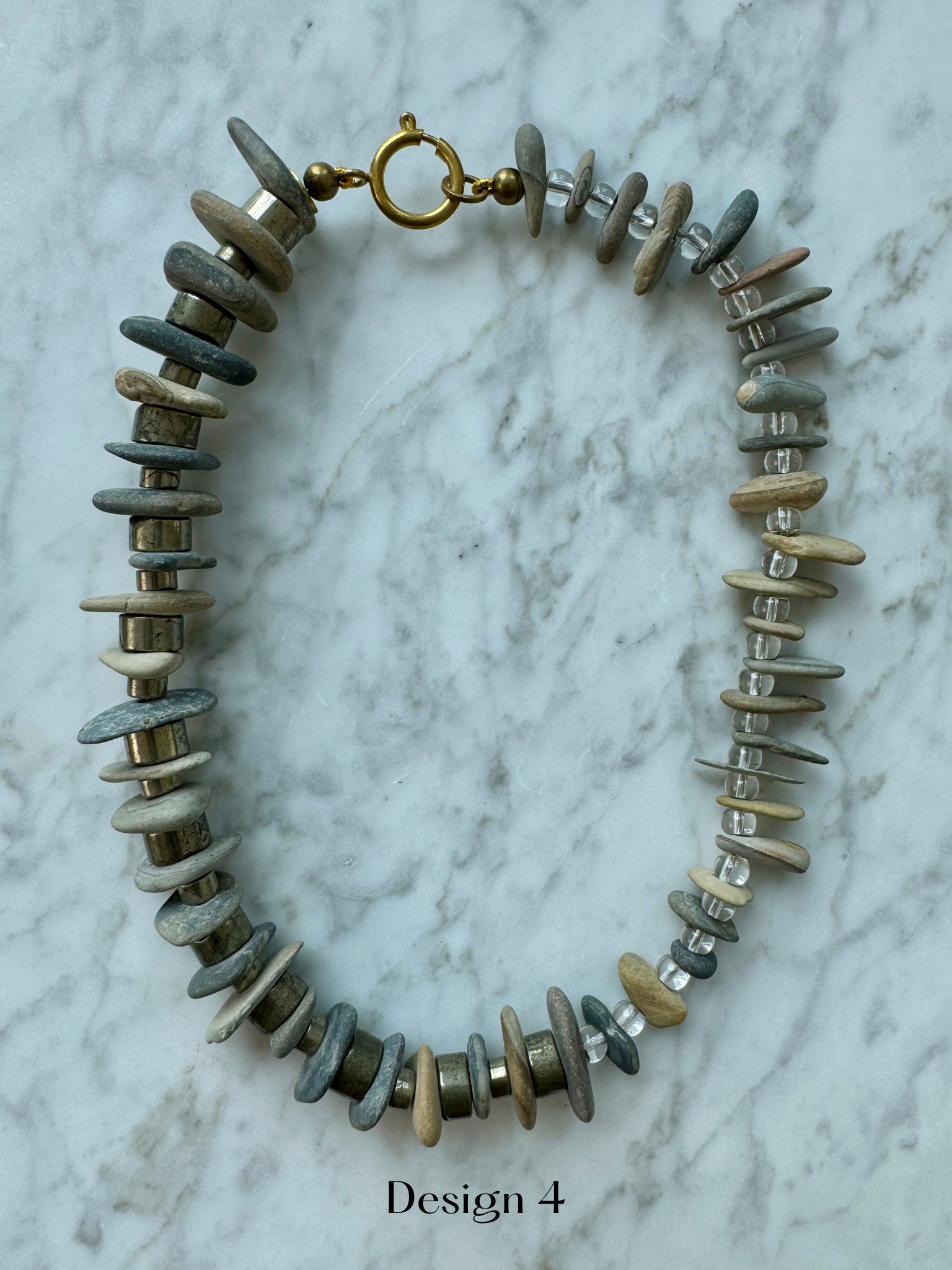 Each design measures 16.5" and is composed of found smooth stones and pyrite with the exception of Design 4 which also has fully charged rock crystal.