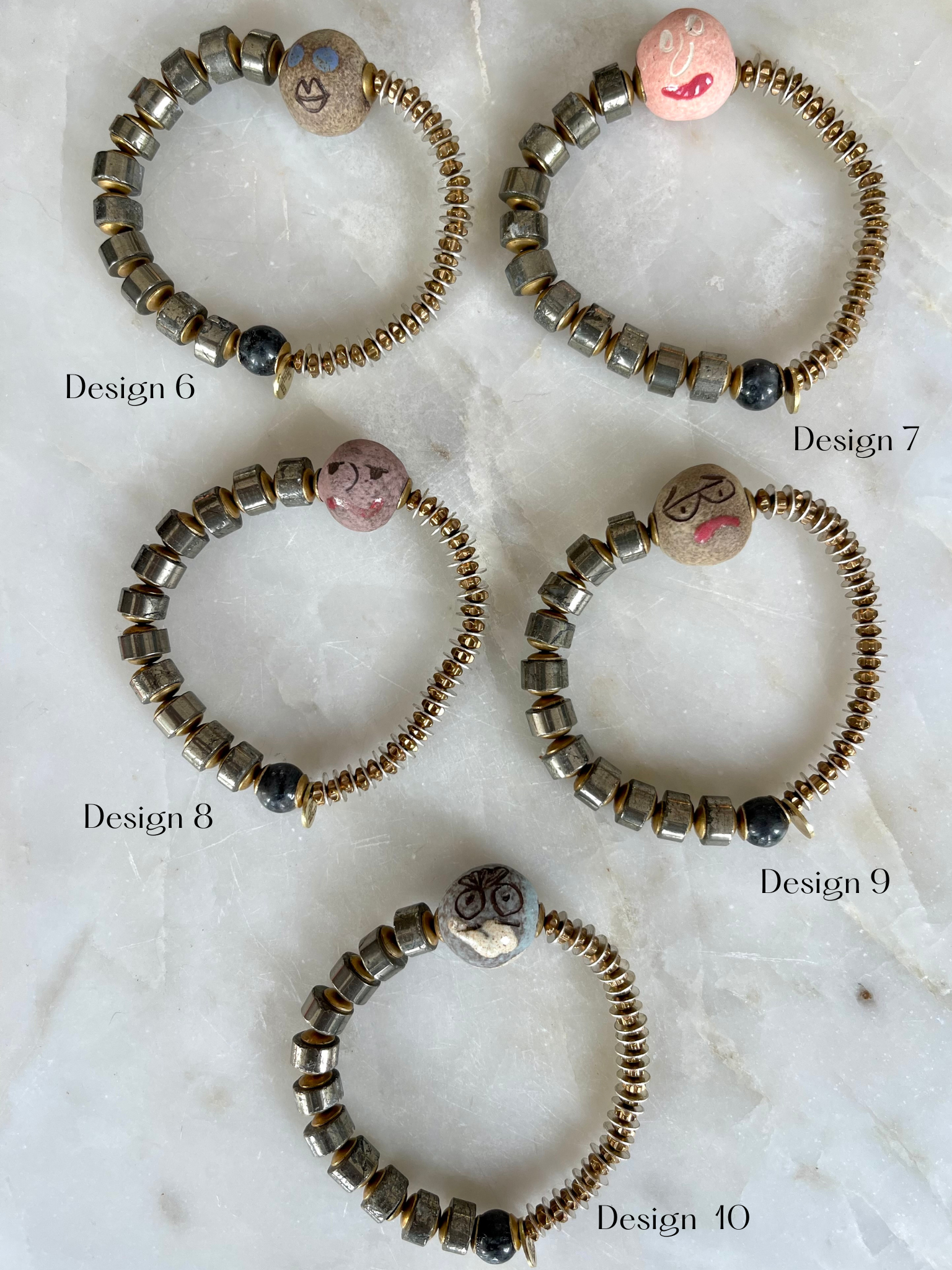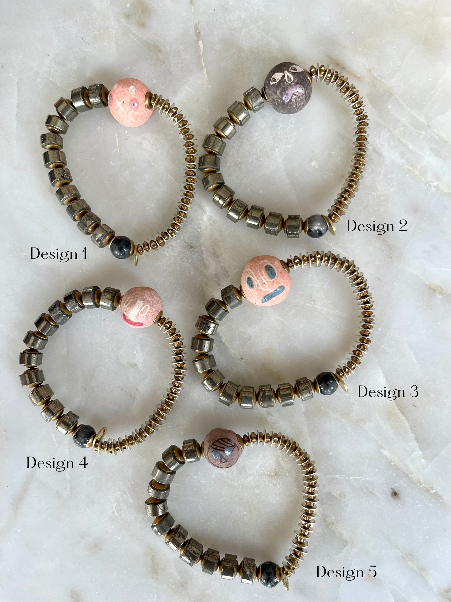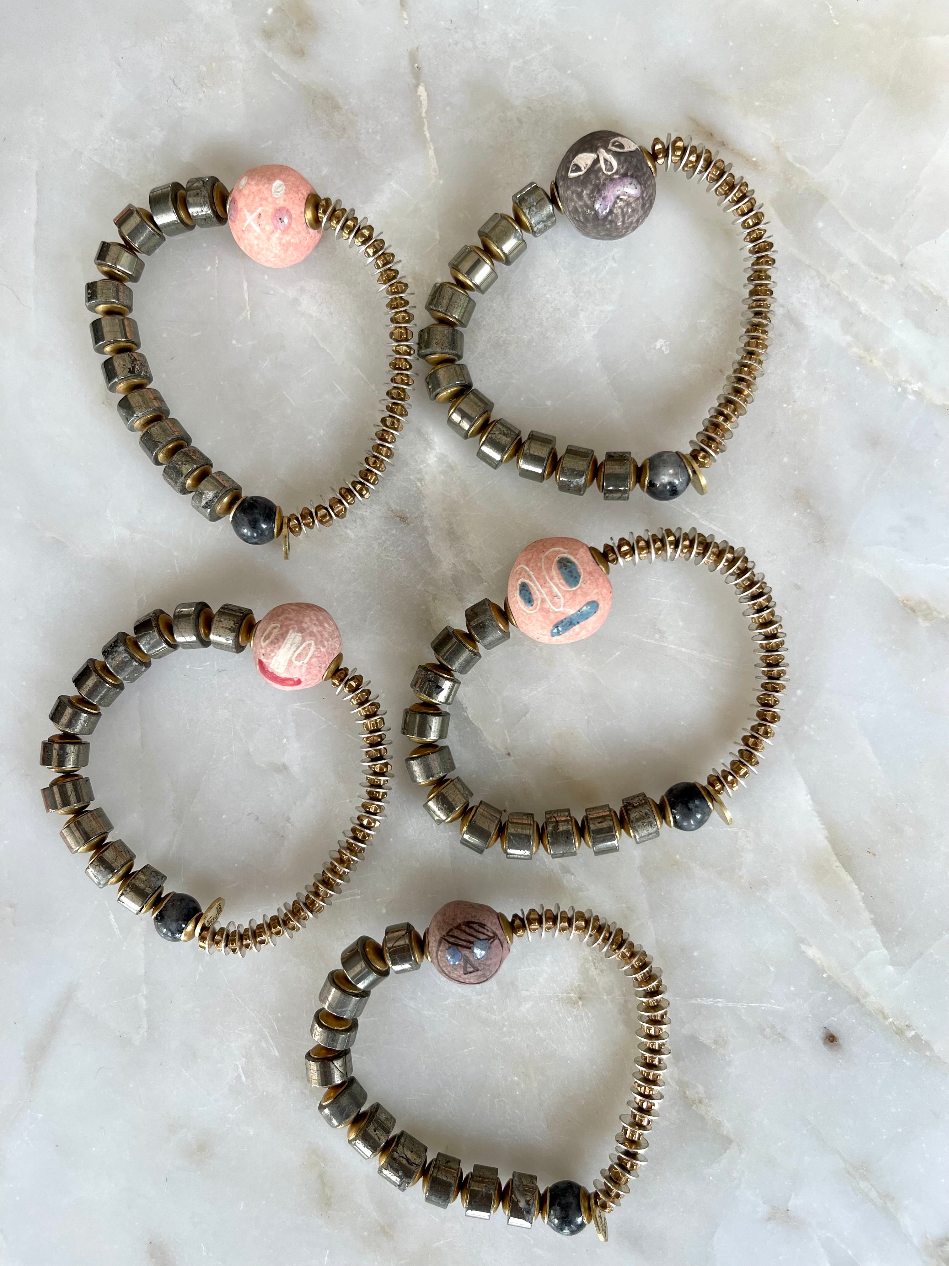 Each bracelet measures 7 inches composed of hematite, handcrafted ceramic face beads and reclaimed brass.