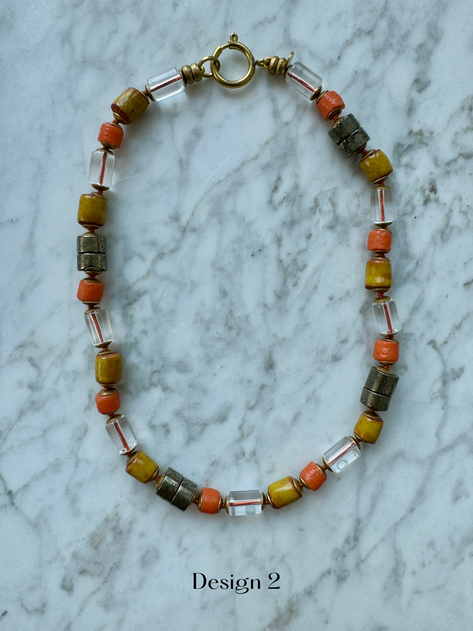 Design 2 measures 17.5" and is composed of fully charged rock crystal, Pyrite, handcrafted mustard ceramic and trade beads all brought together on silk.
