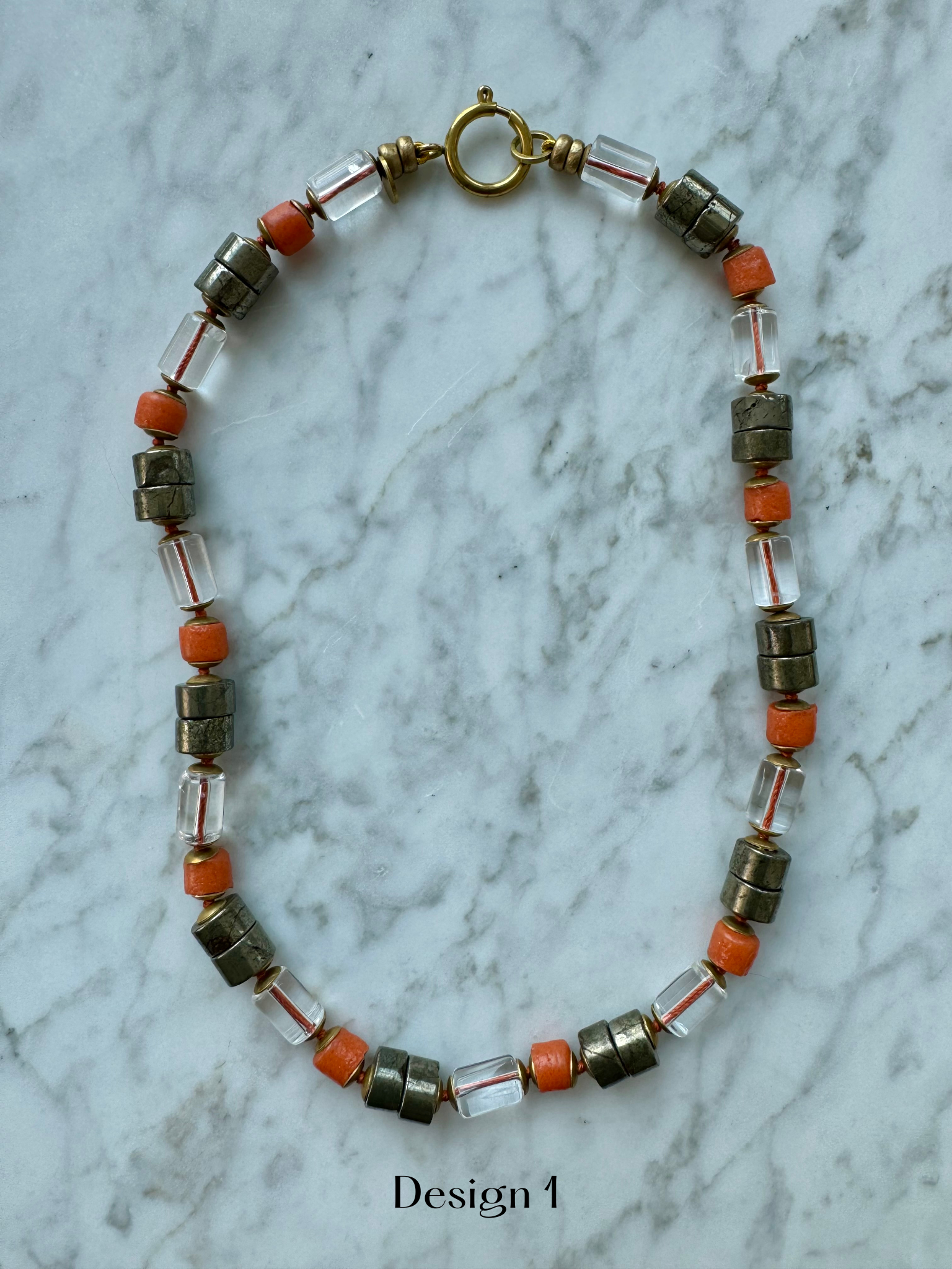 Design 2 measures 17.5" and is composed of fully charged rock crystal, Pyrite, handcrafted mustard ceramic and trade beads all brought together on silk.