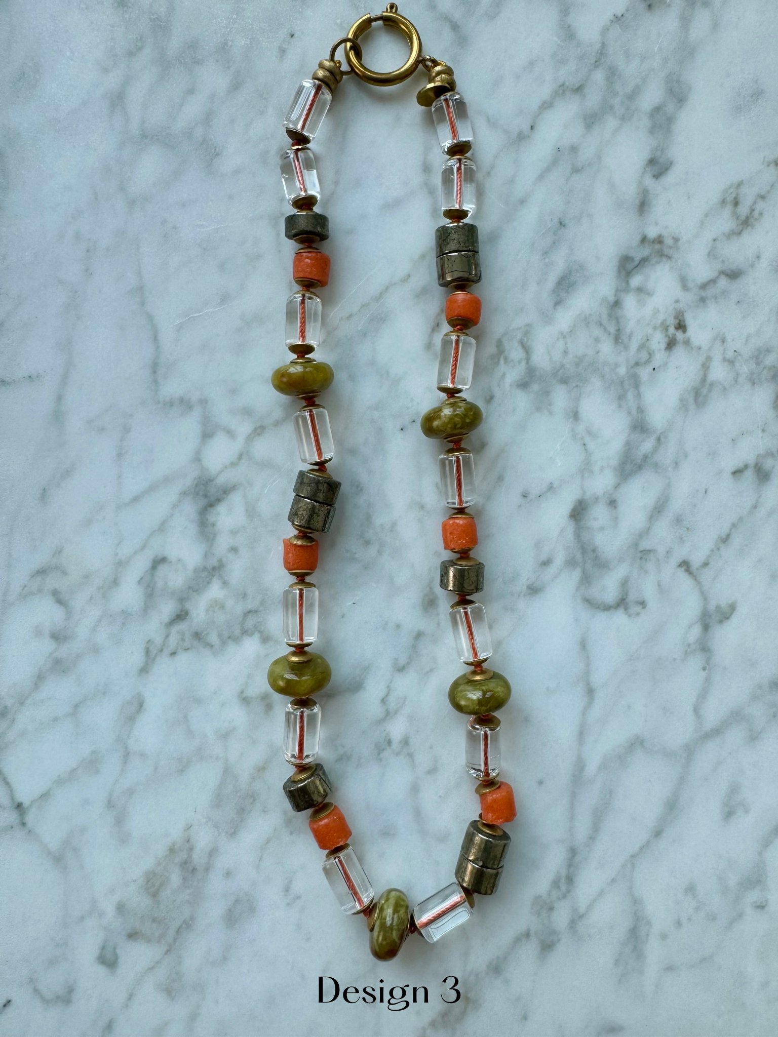 Design 3 measures 17.5" and is composed of fully charged rock crystal, Pyrite, Green Serpentine and trade beads all brought together on silk.
