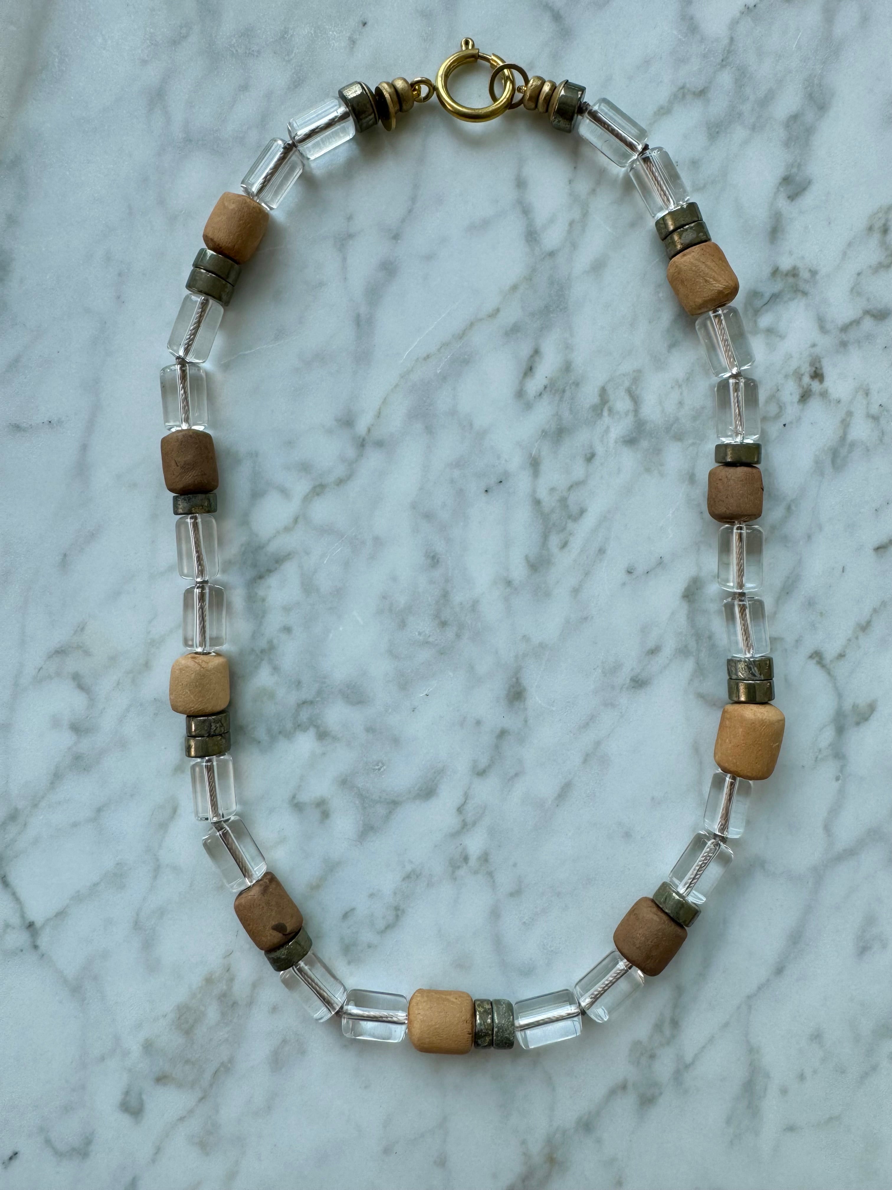 The Terracotta Tranquility necklace measures 19" and is strung on silk featuring fully charged rock crystal, Pyrite and handcrafted ceramic beads.