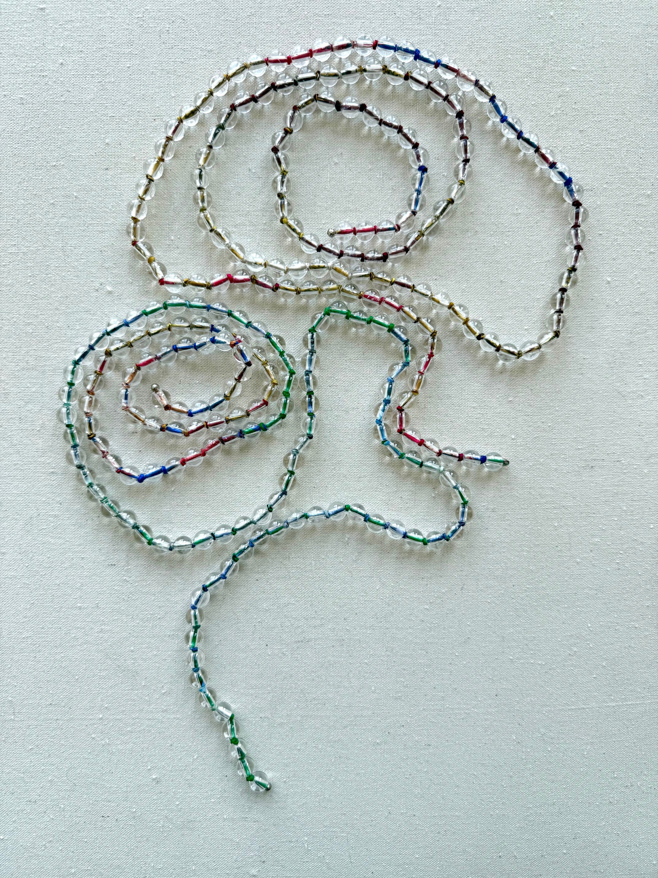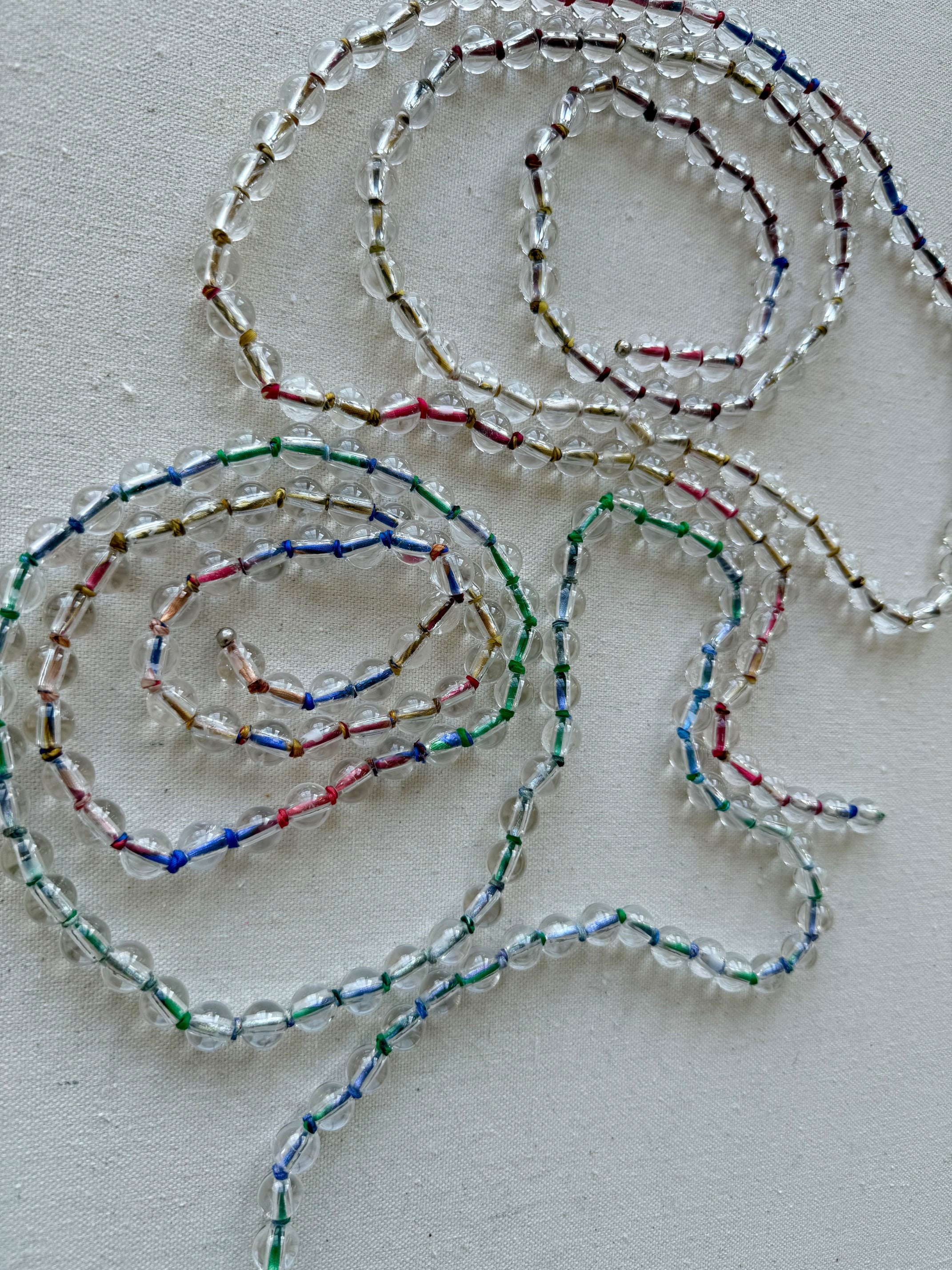 Each necklace features approximately 65 inches of custom-drilled rock crystal beads, meticulously strung to cast light upon deconstructed vintage Hermès scarves. These scarves, sourced from the archives of Vintage Grace, retain their inherent fluidity, offering a novel presentation for the iconic Hermès silk. A colorful silk knot provides both protection and an aesthetic counterpoint to the rock crystal. The harmonious arrangement of these elements creates a distinctive and sophisticated ensemble, embodying a playful elegance.