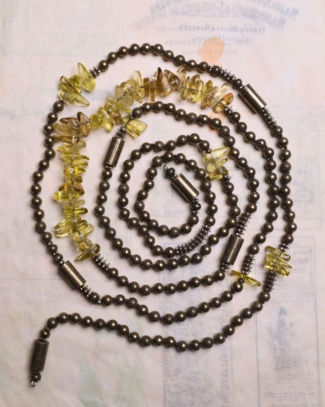 65" wrap is composed of lemon citrine and pyrite all brought together on knotted silk.