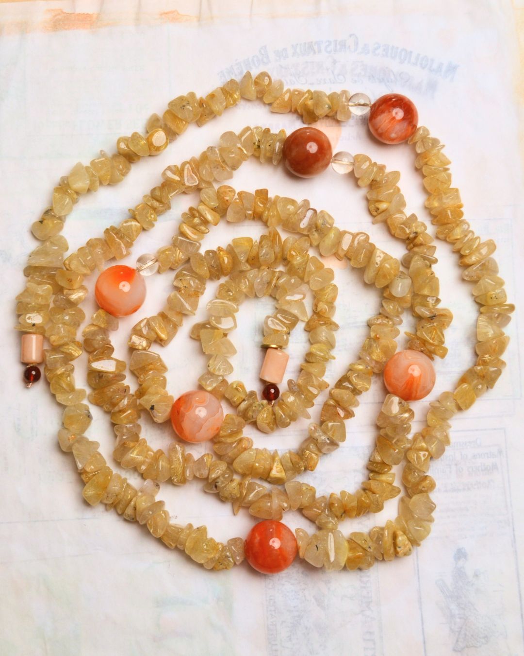 66" and is composed of and is composed of rutilated quartz and agate orbs all brought together on silk.