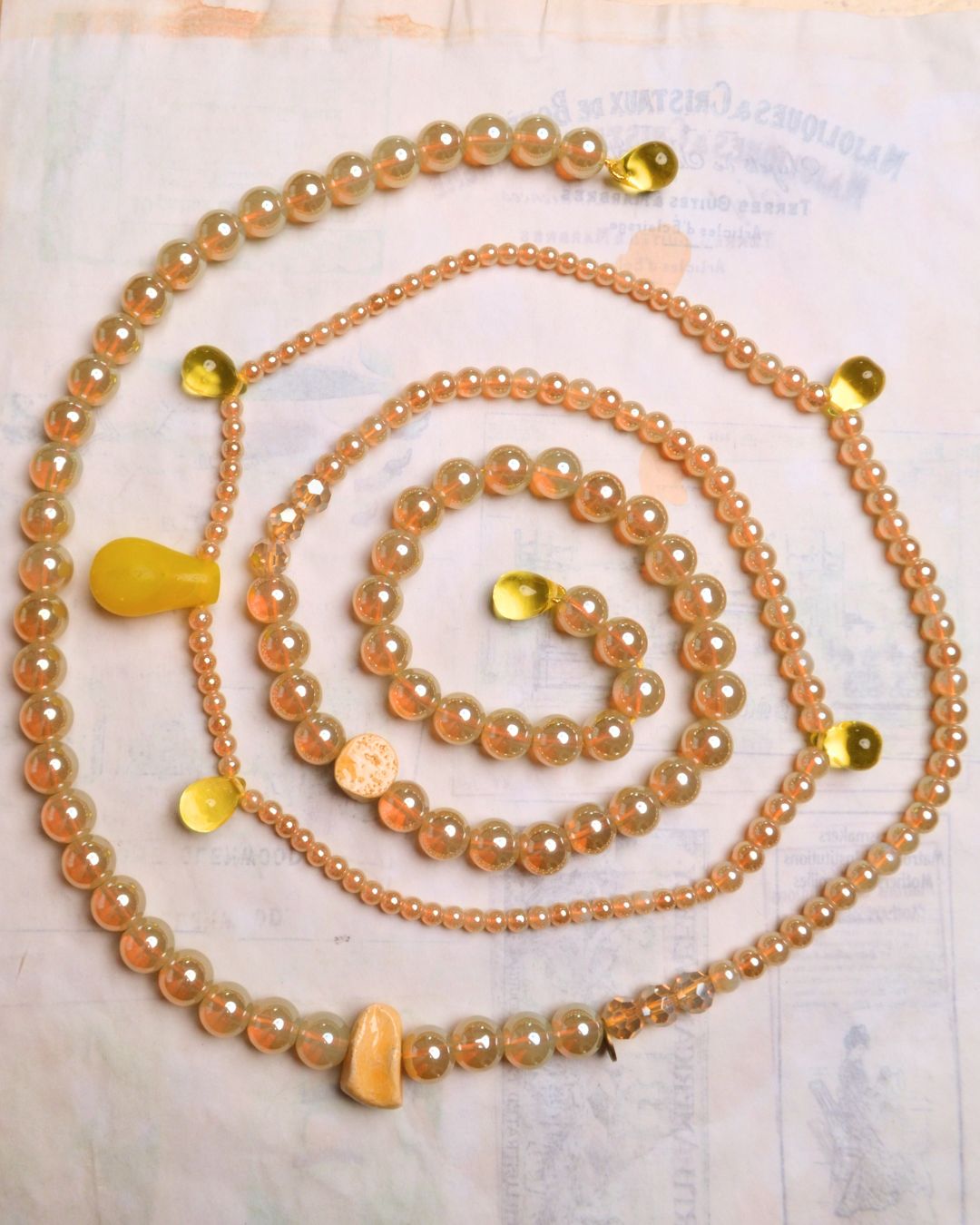 50" and is composed of glass rounds interspersed with handcrafted ceramic and African pressed glass beads, all brought together on silk thread.