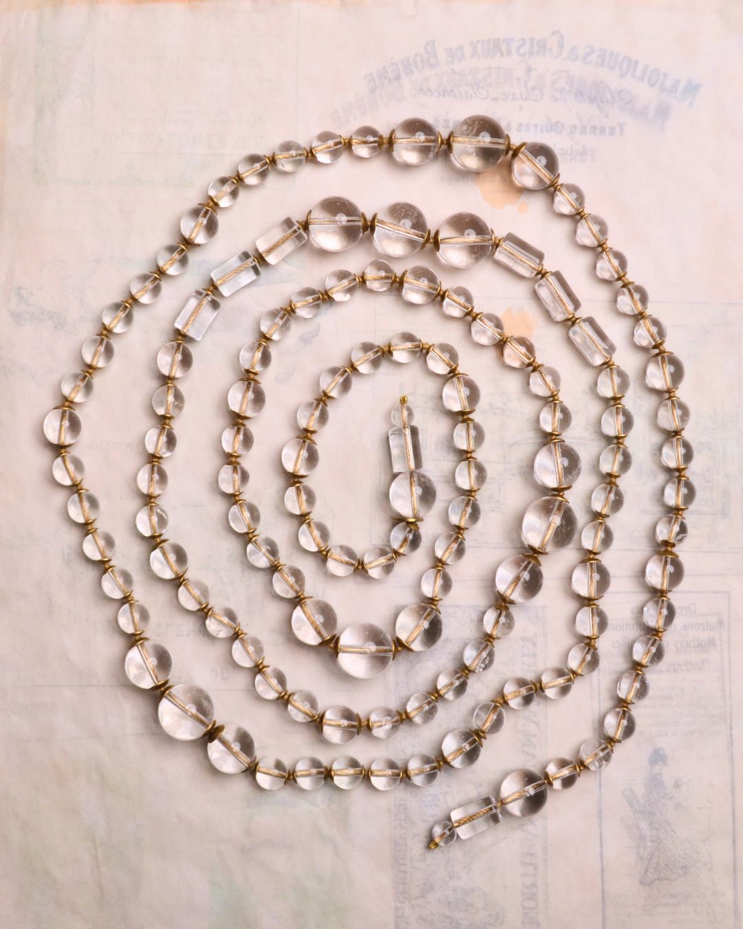 60" and is composed of fully charged rock crystal and reclaimed brass sequins brought together by hand knotting silk.