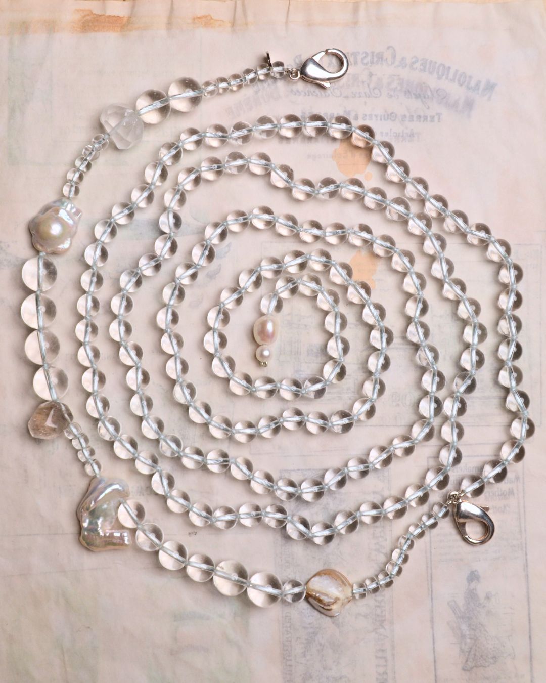 66" and is composed of rock crystal and mother of pearl all brought together by hand knotted silk.
