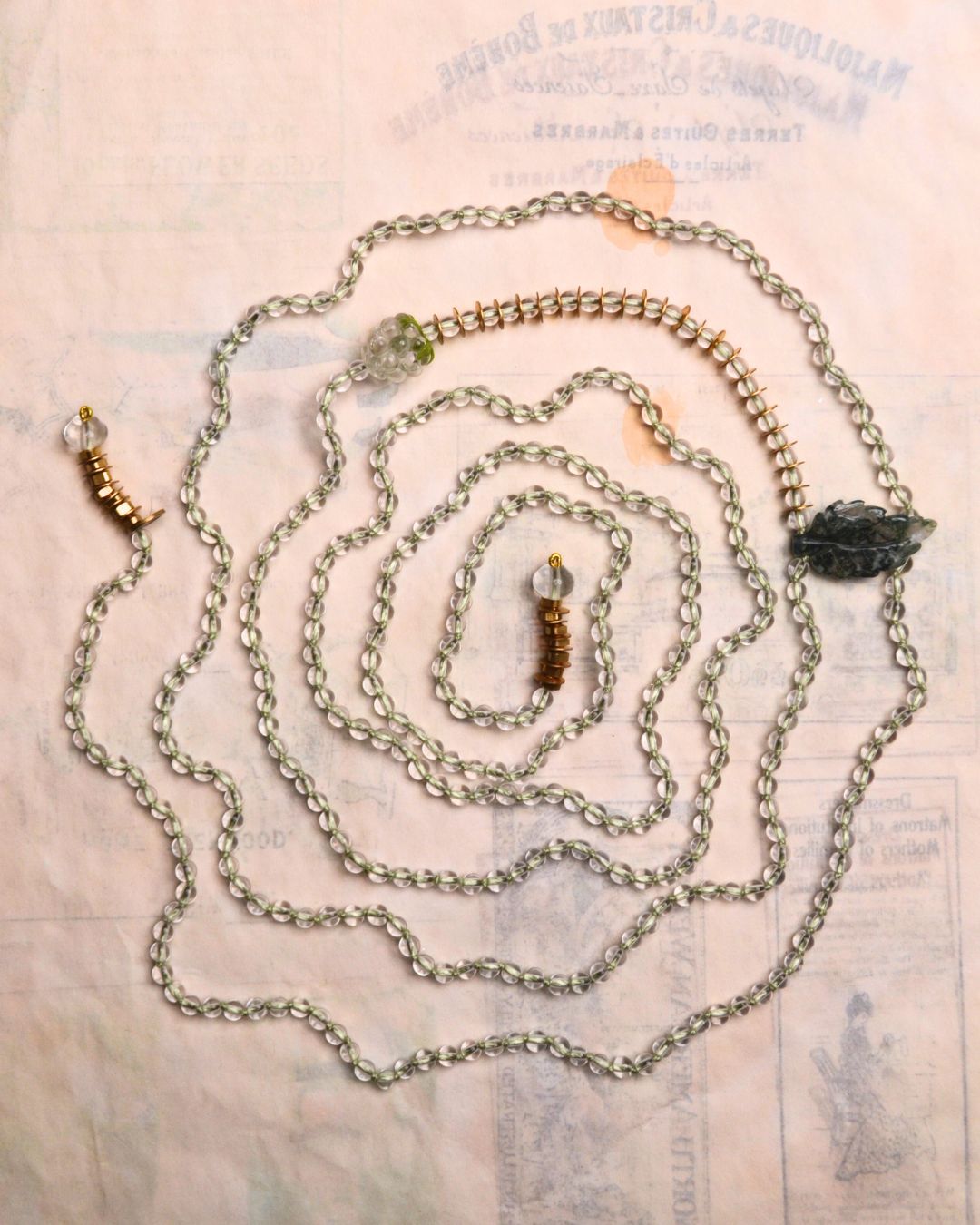 70" and is composed of rock crystal, glass beads, a glass raspberry bead and reclaimed brass all brought together on hand knotted silk.