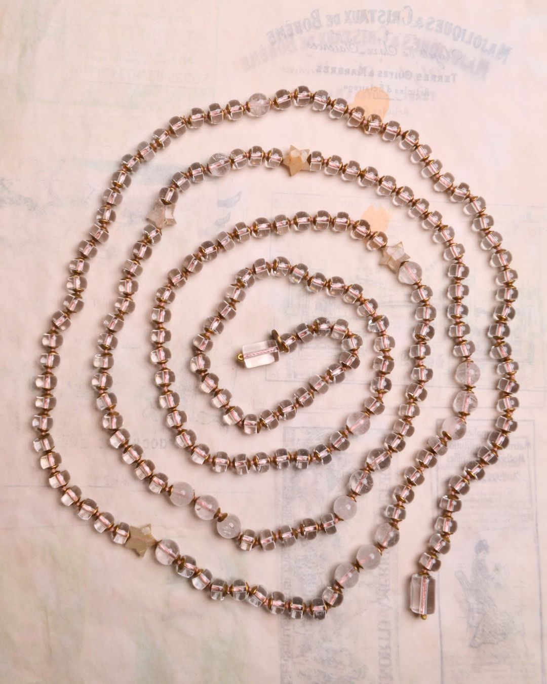 55" and is composed of rock crystal, faceted quartz stars and reclaimed African brass all brought together on hand-knotted silk thread.