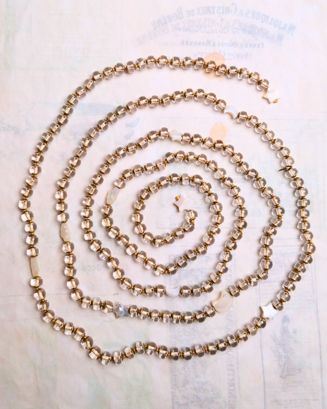 55" and is composed of fully charged rock crystal accented with mother-of-pearl stars, moons, and clouds, and reclaimed African brass all brought together on hand-knotted silk thread.