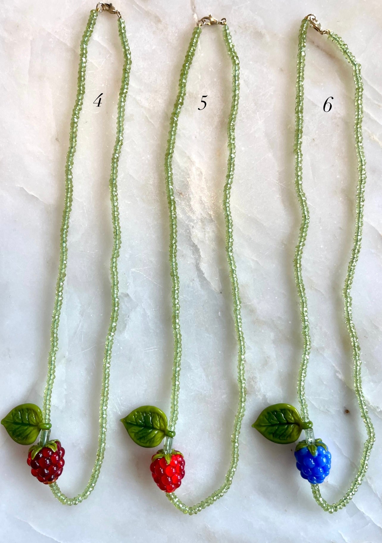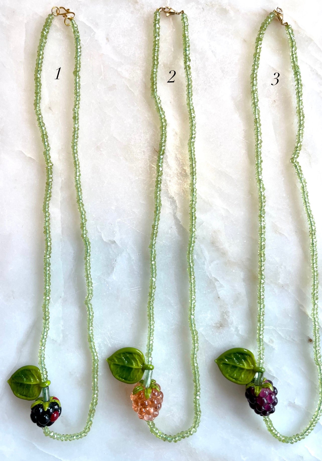 Designs 1 - 6 feature our classic Berry Wonder bead with a tourmaline stem and are surrounded by faceted peridot beads. There necklaces measure 17.5/18-ish inches and have 14K yellow gold clasps.