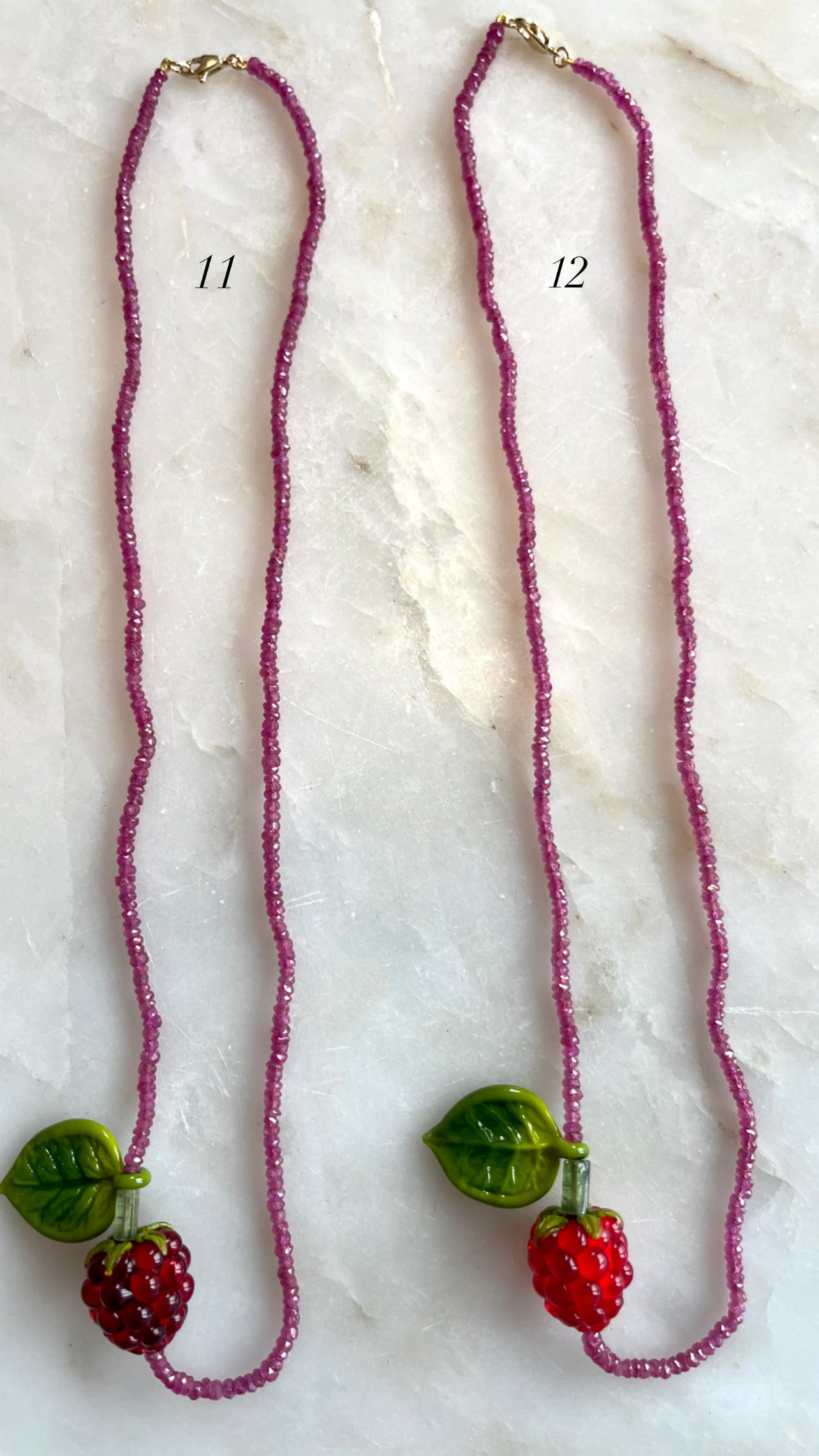 Design 11 - 12 features our classic Berry Wonder bead with a tourmaline stem and is surrounded by faceted rubies. The necklace measures around 17.5/18-ish inches and has a handmade 14K yellow gold clasp.