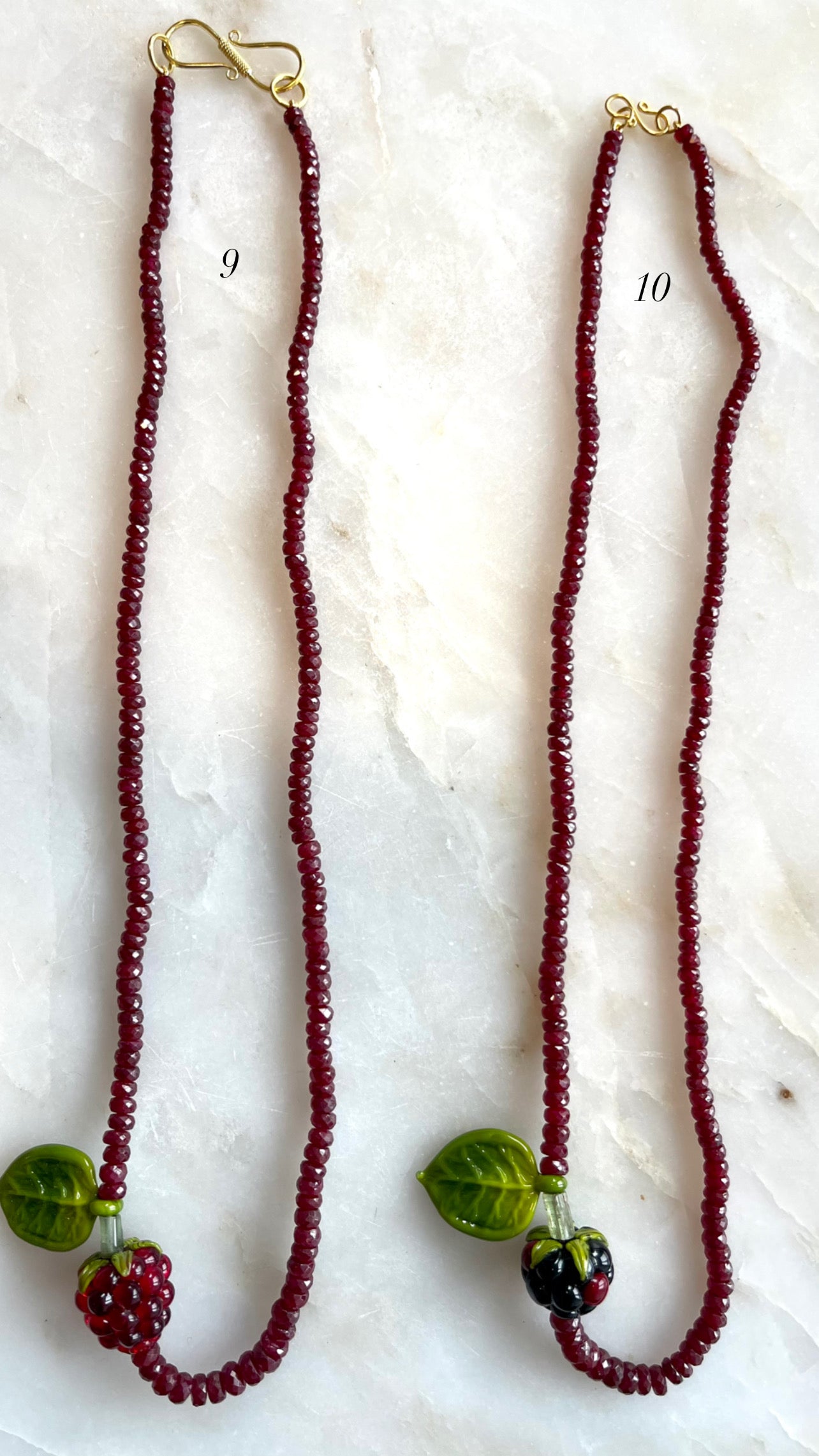 Design 9 - 10 features our classic Berry Wonder bead with a tourmaline stem and is surrounded by faceted rubies. The necklace measures around 17.5/18-ish inches and has a handmade 18K yellow gold clasp.