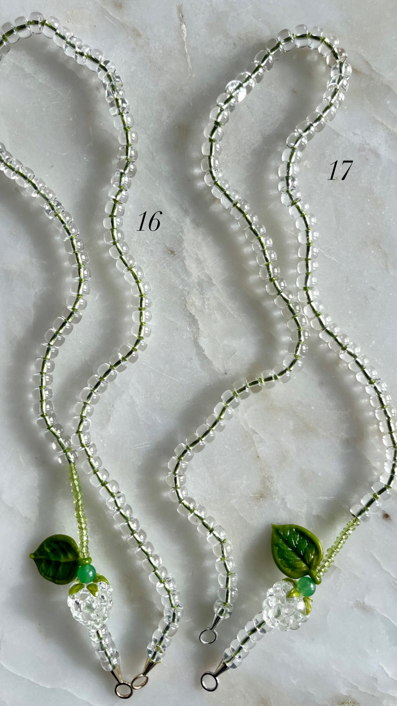 Design 16 - 17 feature our classic Berry Wonder bead with a peridot stem and is surrounded by rock crystal, measures 21 inches and can used to house your favorite charms by leveraging a lock or one of our 14K yellow gold push-locks. D16 is finished with 9K yellow gold loops and D17 is finished with sterling silver loops.