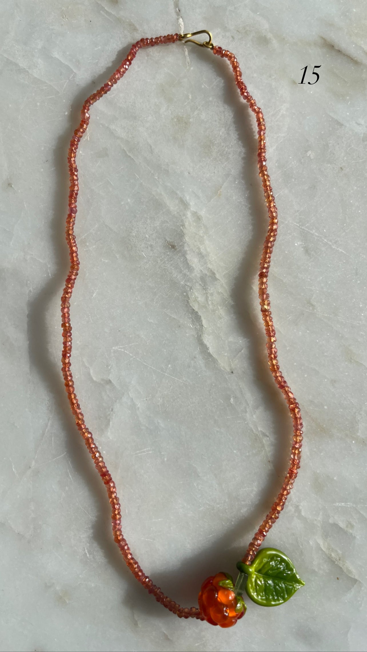 Design 15 features our classic Berry Wonder bead with a tourmaline stem and is surrounded by faceted orange sapphires. The necklace measures around 17.5/18-ish inches and has a 18K yellow gold clasp.