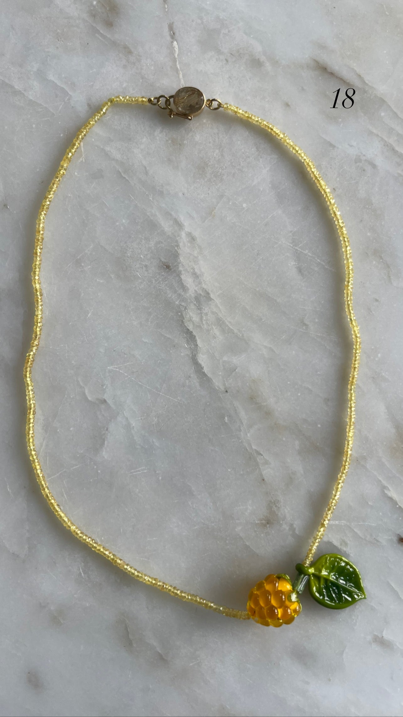 Design 18 features our classic Berry Wonder bead with a tourmaline stem and is surrounded by faceted yellow sapphires. The necklace measures around 17.5/18-ish inches and has a handmade 14K yellow gold clasp encased with rutilated quartz.