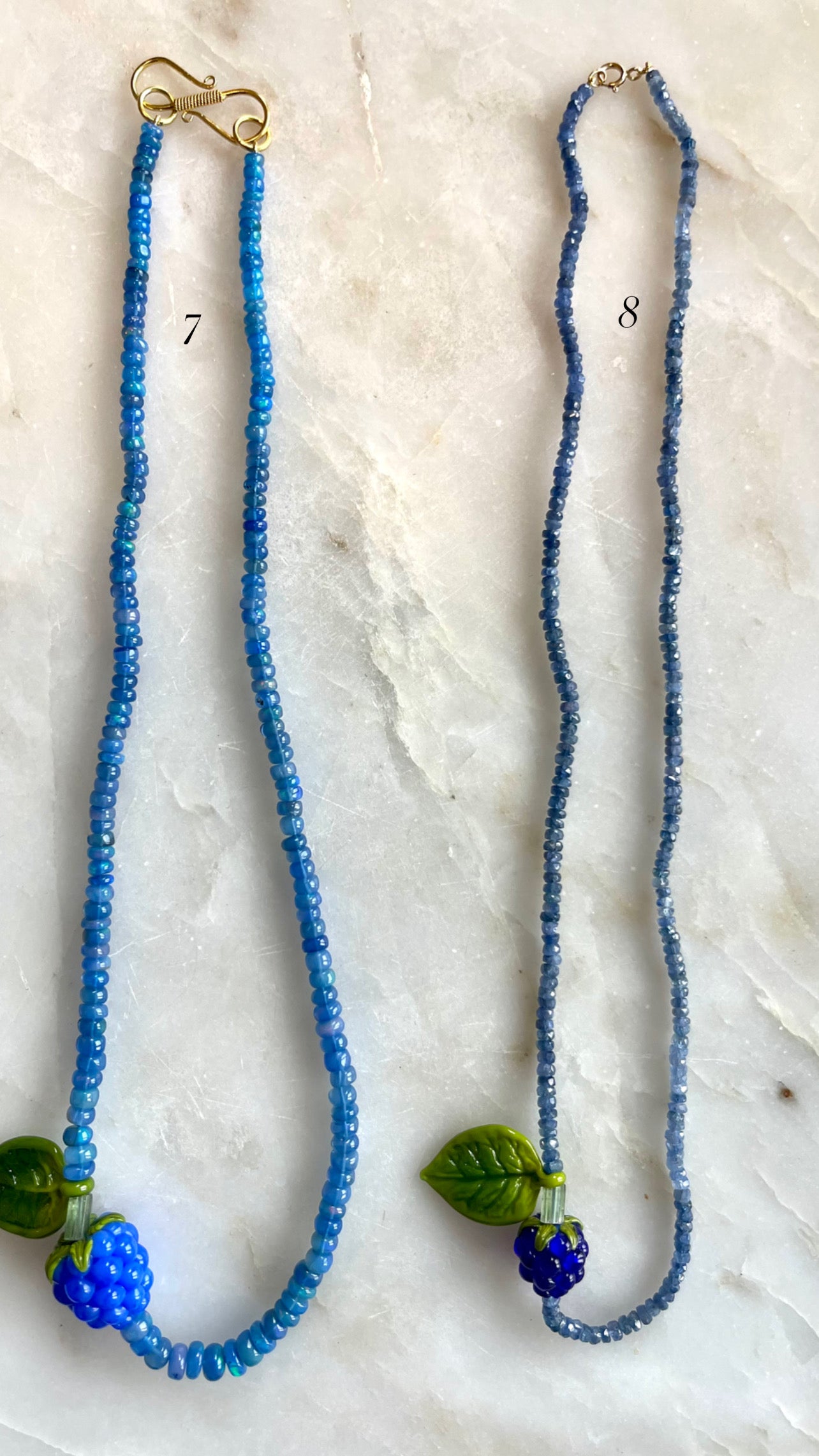Design 8 features our classic Berry Wonder bead with a tourmaline stem and is surrounded by natural blue sapphire beads. The necklace measures around 17.5/18-ish inches and has a 14K yellow gold clasp.