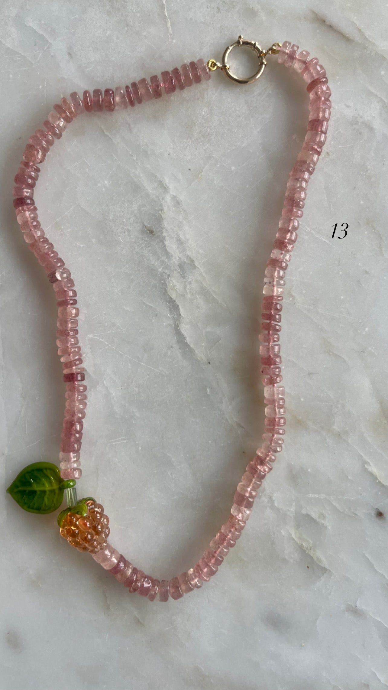 Design 13 features our classic Berry Wonder bead with a tourmaline stem and is surrounded by smooth strawberry quartz beads. The necklace measures around 17.5/18-ish inches and has a 14K yellow gold clasp.