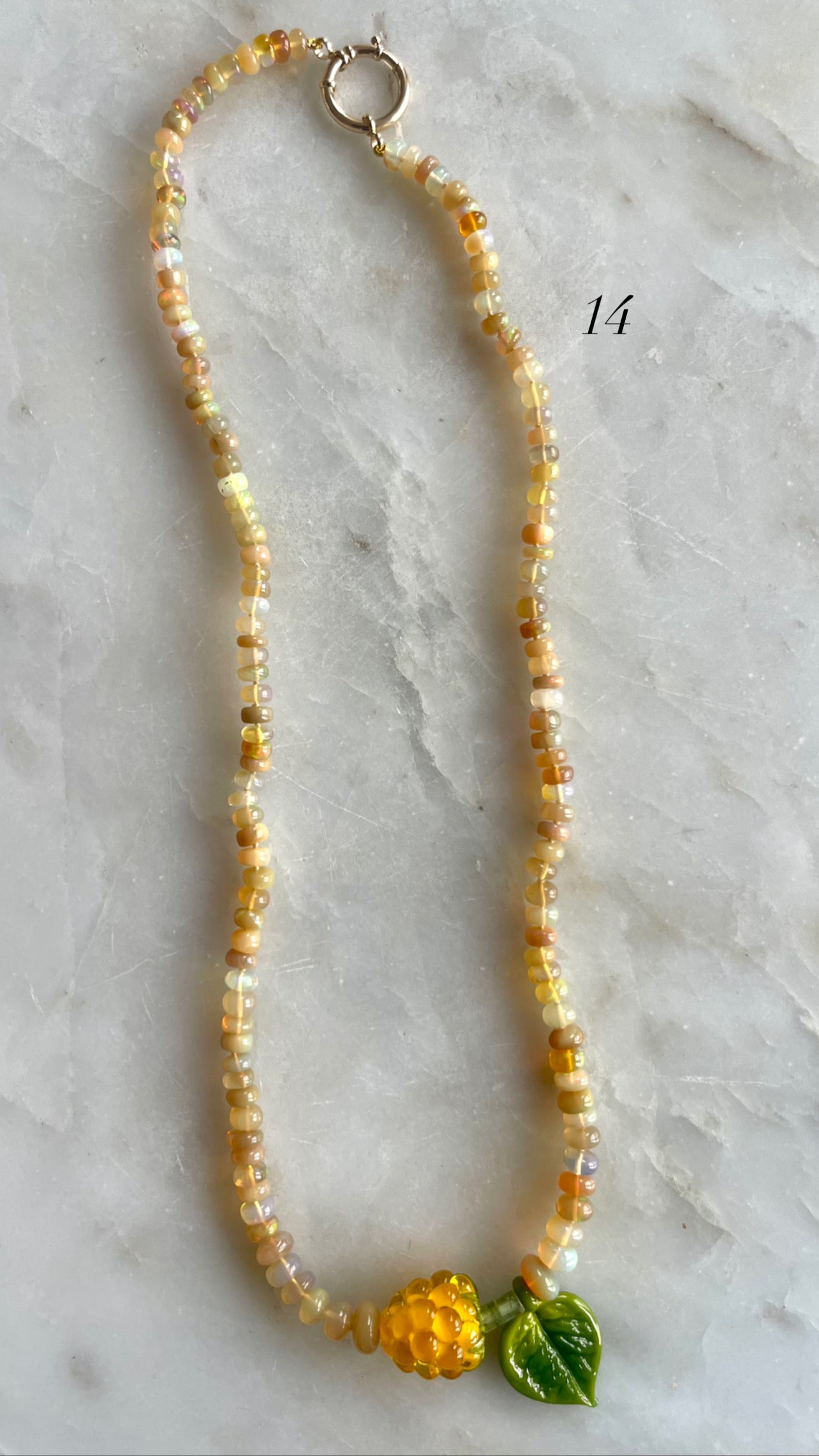 Design 14 features our classic Berry Wonder bead with a tourmaline stem and is surrounded by Ethiopian fire opal beads. The necklace measures around 17.5/18-ish inches and has a 14K yellow gold clasp.
